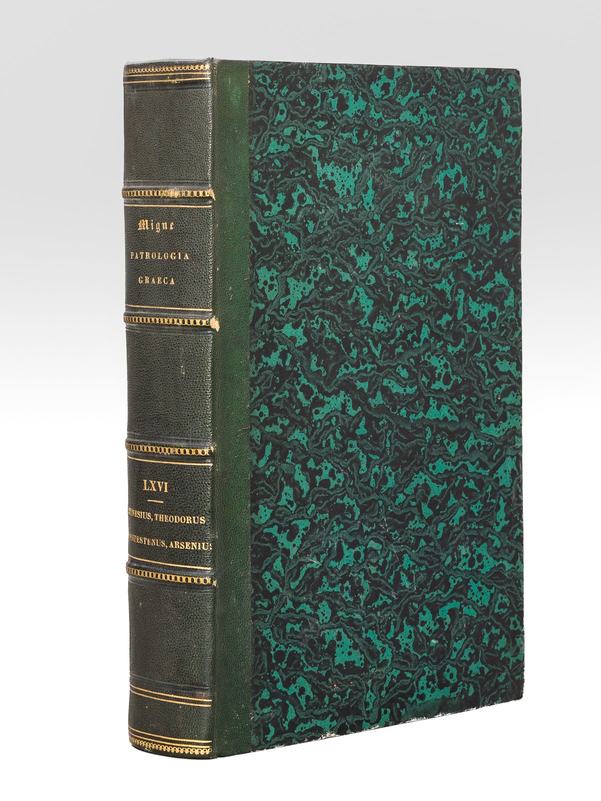 Accurante et denuo recognoscente J.P. Migne, 1 vol. in-4 reliure de l'époque demi-chagrin vert, dos à 4 nerfs dorés, Apud J.P. Migne, Petit-Montrouge, 1859, 1272 colonnes Rappel du Titre complet : Synesii Episcopi Cyrenes Opera quae exstant omnia. Accedunt Theodori Mopsuesteni Episcopi, S. Arsenii Eremitae Scripta vel Scriptorum Fragmenta quae supersunt (1 Tome - Complet). Patrologiae Cursus completus. Series Graeca. Tomus LXVI [ Patrologia Graeca Tome 66 - Théodore de Mopsueste, Synésios, Arsène le Grand ] Rare exemplaire en bon état, bien relié, du tome 65 de la Patrologie grecque de Migne, bien complet des oeuvres de Théodore de Mopsueste, Synésios et Arsène le Grand. Avec le texte grec et la traduction latine en regard (coupes lég. frottées, ancien cachet de monastère, rares rouss., très bon état par ailleurs). Peu commun, surtout en si bon état. A rare, well-bound, and in good condition copy of Volume 65 of Migne's Greek Patrology, complete with the Works of Theodore of Mopsuestia, Synesius, Arsenius the Great. With the Greek text and the Latin translation opposite.