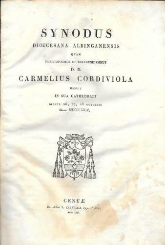 in 4°, pp. 71, 4, leg. coeva m/perg. con angoli con tit. manos. al ds., piatti in carta blu, vignetta alle armi vescovili al front. Atti del sinodo tenuto dal 26 al 28 ottobre 1824, da Carmelo Cordiviola, vescovo di Albenga dal 1820 alla sua morte, per riflettere sulla conformità della comunità agli insegnamenti di Cristo. Aloni d'umido interessano quasi tutto il vol. 043/34