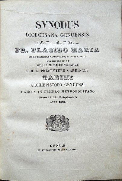 Synodus Dioecesana Genuensis ab Em.mo ac Rev.mo Domino Fr. Placido Maria ordinis Beatissimae Mariae Virginis de Monte Carmelo . Presbytero Cardinali Tadini Archiepiscopo Genuensi habita in templo metropolitano diebus 11, 12, 13 Septembris anno 1838