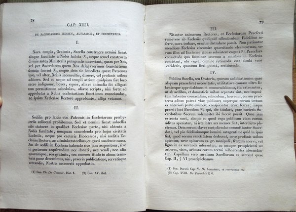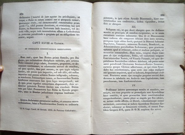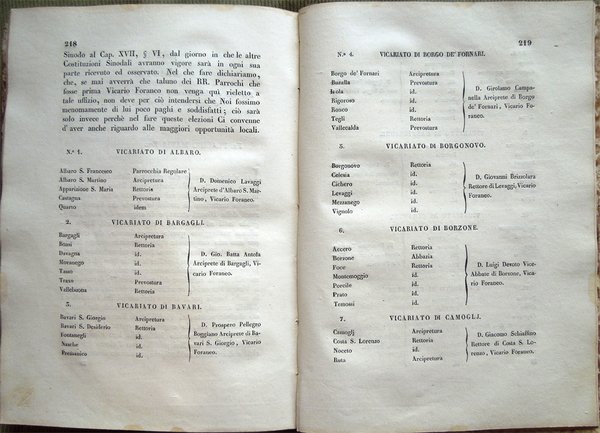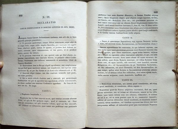 In-8° (24,7 x 17,4 cm), pp. XI, (1), 237, (3), legatura coeva in mezza pelle. Qualche normale segno d'uso e del tempo alla legatura, in particolare, leggere abrasioni al dorso, con una piccola mancanza, di 0,7 x 0,6 cm, nella parte inferiore. Strappetto ben rimarginato da piccolo intervento di restauro eseguito con carta giapponese nel margine superiore della guardia anteriore e nel bordo inferiore del foglio con le pagine 55-56. Nel margine esterno di pagina 74, macchia di inchiostro del diametro di millimetri 9, macchia che non interessa il testo. Lievi aloni d'umido ai tagli di testa e di piede, alle guardie e alle ultime pagine. Rarissime, leggere tracce d'umido alle pagine, per il resto esemplare fresco e ben conservato. Tra i vari documenti riportati nell'Appendix ad Synodum, segnaliamo l'Editto per cui si descrivono i limiti de' Vicariati Foranei e sono eletti i rispettivi Vicarii (con indicazione delle arcipreture, prevosture, rettorie e dei vicari foranei dei vicariati di Albaro, Bargagli, Bavari, Borgo de' Fornari, Borgonovo, Borzone, Camogli, Carro, Castiglione, Ceranesi, Chiavari, Cicagna, Favale, Framura, Garibaldo, Montobbio, Neirone, Nervi, Palmaro, Portofino, Recco, Rivarolo, Rosso, San Cipriano, Santa Margarita - Santa Margherita, Sant'Olcese, San Pier d'Arena, Serra, Sestri, Sori, Stroppa, Sturla, Varese - Ligure, Vobbia, Voltaggio, Voltri, Uscio, Zoagli), le Parrocchie componenti il collegio de' MM. RR. Parrochi della città di Genova secondo l'ordine di precedenza e il Sommario delle Parrocchie della Diocesi di Genova.