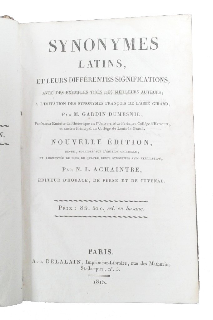 Synonymes latins, et leur differentes significations, avec des exemples tires des meilleurs auteurs; a l'imitation des synonymes francois de l'Abbe Girard, par M. Gardin Dumesnil, Professeur Emerite de Rhetorique en l'Universite de Paris, au College d'Harcourt, et ancien Principal au College de Louis-le-Grand. Nouvelle edition, revue, corrigee sur l'edition originale, et augmentee de plus de quatre cents synonymes avec explication, par N. L. Achaintre, editeur d'Horace, de Perse et de Juvenal.