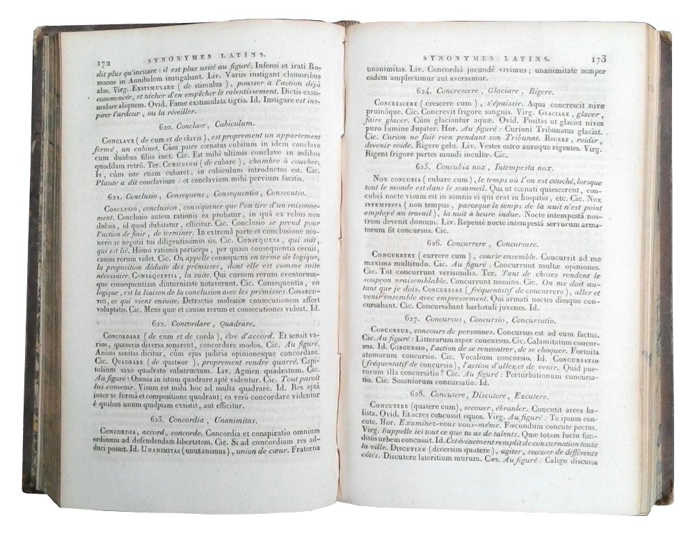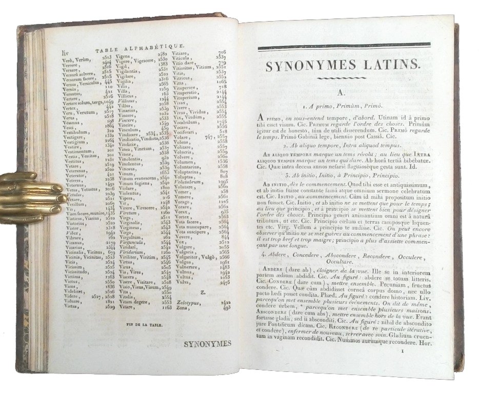 in-8° (198x122 mm); leg. in piena pelle marrone, dorso liscio con titolo in oro su tassello in pelle rossa, decori e falsi nervi in oro al dorso, guardie in carta marmorizzata, tagli a spruzzo marmorizzati; pp. LIV, 680. Seconda edizione; sul front.: "Prix: 6 fr. 50 c. rel. en basane"; sul v. dell'occhietto e sul v. del front. nome dell'editore, Auguste Delalain. Rif.: IT\ICCU\UBOE\042965 (1 copia presso la Biblioteca di discipline umanistiche - Bologna). Cond.: Cerniera anteriore e cuffia sup. leggermente danneggiate; angoli consumati; nel complesso, opera in condizioni generali molto buone. -- SECOND EDITION OF THIS WORK ON LATIN SYNONYMS, AND THEIR DIFFERENT MEANINGS. Front hinge and upper spine-end slightly damaged; corners worn; overall, copy in very good condition.