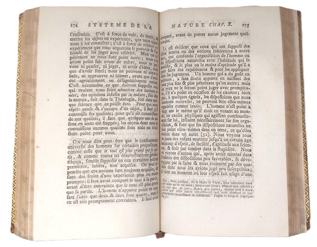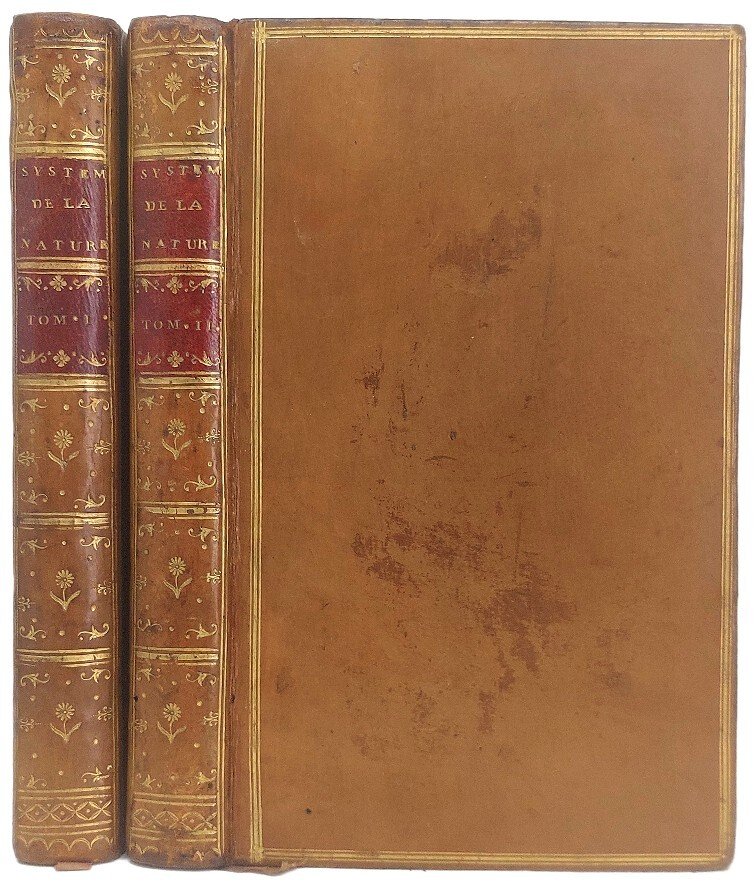 >2 volumi in-8 (198x120 mm), pp. (12), 366; (6), 408; legatura coeva in vitellino nocciola, triplice filetto oro ai piatti, fregi floreali e tassello granata al dorso, tagli dorati. Prima edizione, seconda tiratura (errata corrige e punto anzichè virgola dopo Londres al titolo), della "Bibbia del Materialismo", pubblicata sotto il nome di J.B. Mirabaud (traduttore e polemista antireligioso deceduto da tempo) nel 1770, e subito messa al rogo. La più nota opera di Holbach (1723-1789), in cui l'autore sviluppa i motivi critici del razionalismo deterministico di Diderot, esaltando il materialismo causalistico e negando la metafisica. Il suo Sistama, volto al raggiungimento della felicità intesa come benessere individuale, risulta un'esasperazione del pensiero dell'Illuminismo, e come tale fu respinto dallo stesso Voltaire. "Nel Système Holbach... continuò il suo attacco diretto alla religione cercando di dimostrare che essa derivava interamente dall'abitudine e dalla consuetudine. Ma il Système non era un libro negativo o distruttivo: Holbach rifiutava la religione perché la considerava un'influenza del tutto dannosa e cercava di fornire un'alternativa più desiderabile. Infatti, delineò un'intera filosofia etica e politica, che ampliò nelle sue opere successive" (cfr. Printing and the Mind of Man). L'opera raggiunse rapidamente le 10 edizioni. Bell'esemplare, estremamente fresco. Vercruysse A4. PMM 215 (1st editon). Tchemerzine III, 727. Printing and the Mind of Man, n. 215.