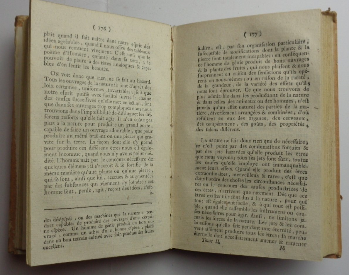 Nouvelle édition. Due volumi (11,5x18 cm). Première partie: (12)-397 pagine. Seconde partie: (4)-454-(2) pagine. Un po' corto il margine inferiore. Legatura coeva in mezza pelle, dorso liscio ornato e dorato, piatti cartonati con carta arancione. Ottime condizioni. Edizione a due date diverse per il primo (1774) e il secondo (1775) volume e stampate in due diverse tipografie, cosa non rara per questo tipo di pubblicazioni proibite (l'indicazione Londres è fittizia) o che venivano clandestinamente importate in Francia.