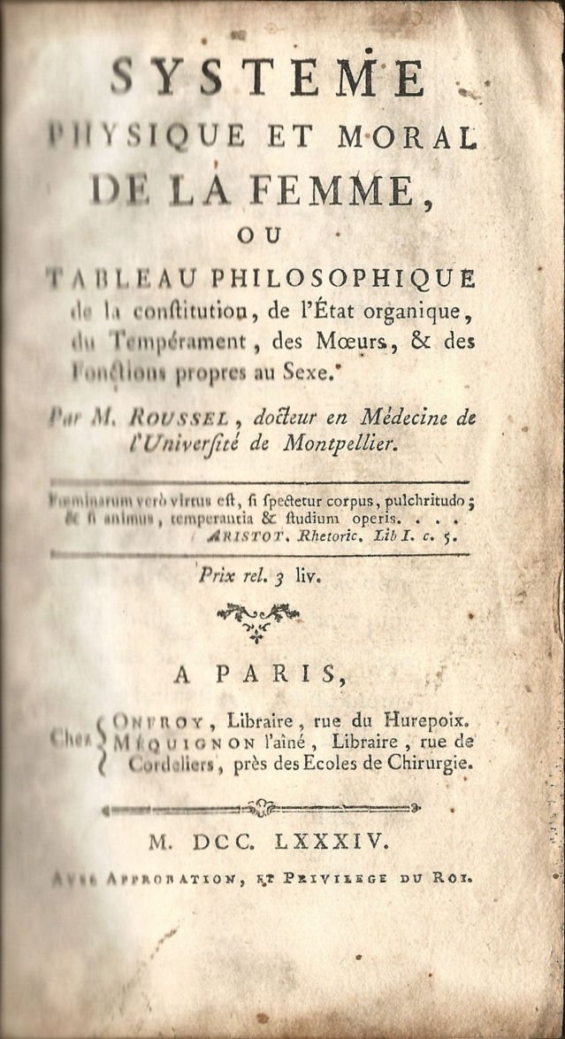 Systeme physique et moral de la femme, ou Tableau philosophique de la constitution, de l'état organique, du tempérament, des moeurs, & des fonctions propres au sexe. Par m. Roussel [.].