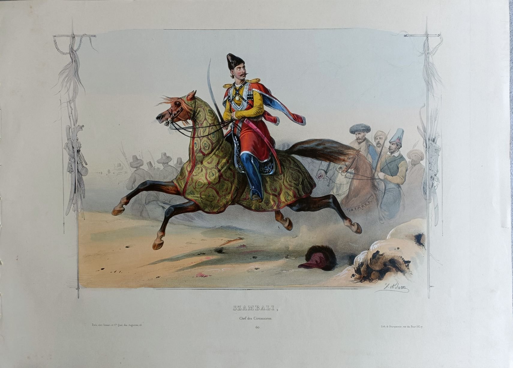 >Litografia originale con bellissima colorazione coeva e rialzi a' la gomme (mm 370x510), firmata in basso a destra "V. Adam". Titolo e note tipografiche lungo il margine inferiore. Bell'esemplare qualche lievissima macchietta rossa. Adam Jean Victor fu artista molto prolifico, pittore, acquarellista, incisore. Nel 1824 si avvicinò alla litografia con la raccolta ''Un an de vie de jeune homme''.