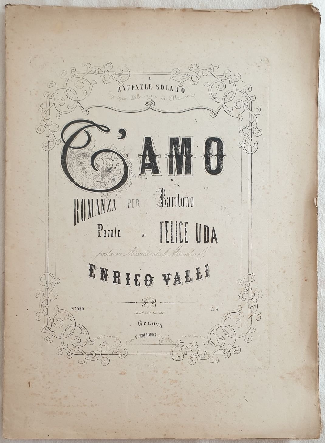 Edizione del 1870 circa di questo spartito per pianoforte ed arpa del compositore italiano Enrico Valli "T'amo". Bella illustrazione al frontespizio. Ottime condizioni. Legatura assente. In 4. cm 36x26. pp. 12. Edition of 1870 circa of this musical score for piano by the italian composer Enrico Valli "T'amo". Beauitufl illustration in the title page. Very good conditions. Binding is missing. In 4. cm 36x26. pp. 12.