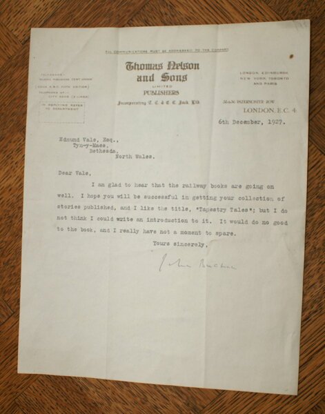 8vo., single sheet on the printed stationery of Thomas Nelson the publisher (Buchan was a director of this company among several others); dated 6 December 1927; addressed to Edmund Vale at his home address in Bethesda, North Wales; very lightly age-browned but a clear, crisp letter with strong signature 'John Buchan'. The letter is friendly if somewhat imperious in tone ('Dear Vale'). Buchan is glad that Vale's 'railway books are going on well' ands hopes that Vale will be successful in getting his collection of stories published (but evidently not by Nelson). Buchan likes the projected title 'Tapestry Tales' but declines to provide an introduction: 'it would do no good to the book and I really have not a moment to spare'. John Buchan (1875-1940), polymath, writer, statesman and businessman. Suffice it to say that letters signed by him are scarce. Henry Edmund Theodoric Vale ('Edmund Vale'; 1888-1969) was a prolific and successful author and topographer. He wrote many topographical titles for Henry Batsford including 'The Seas and Shores of England' (1936) in the well-known 'British Heritage' series. He produced at least one title for Nelson - the adventure story 'Porth Smuggler' (1926) - and his relationship with Buchan may well stem from this event. Vale's 'railway books' referred to in the letter are almost certainly his much-loved LMS Route Books which include 'The Track of the Irish Mail', 'The Track of the Twenty Fives' and 'The Track of the Royal Scot', all published in the late twenties. Curiously we have been unable to identify the collection of stories referred to by Buchan as 'Tapestry Tales', for there appears to be no book with this title among Vale's considerable and wide-ranging bibliography.
