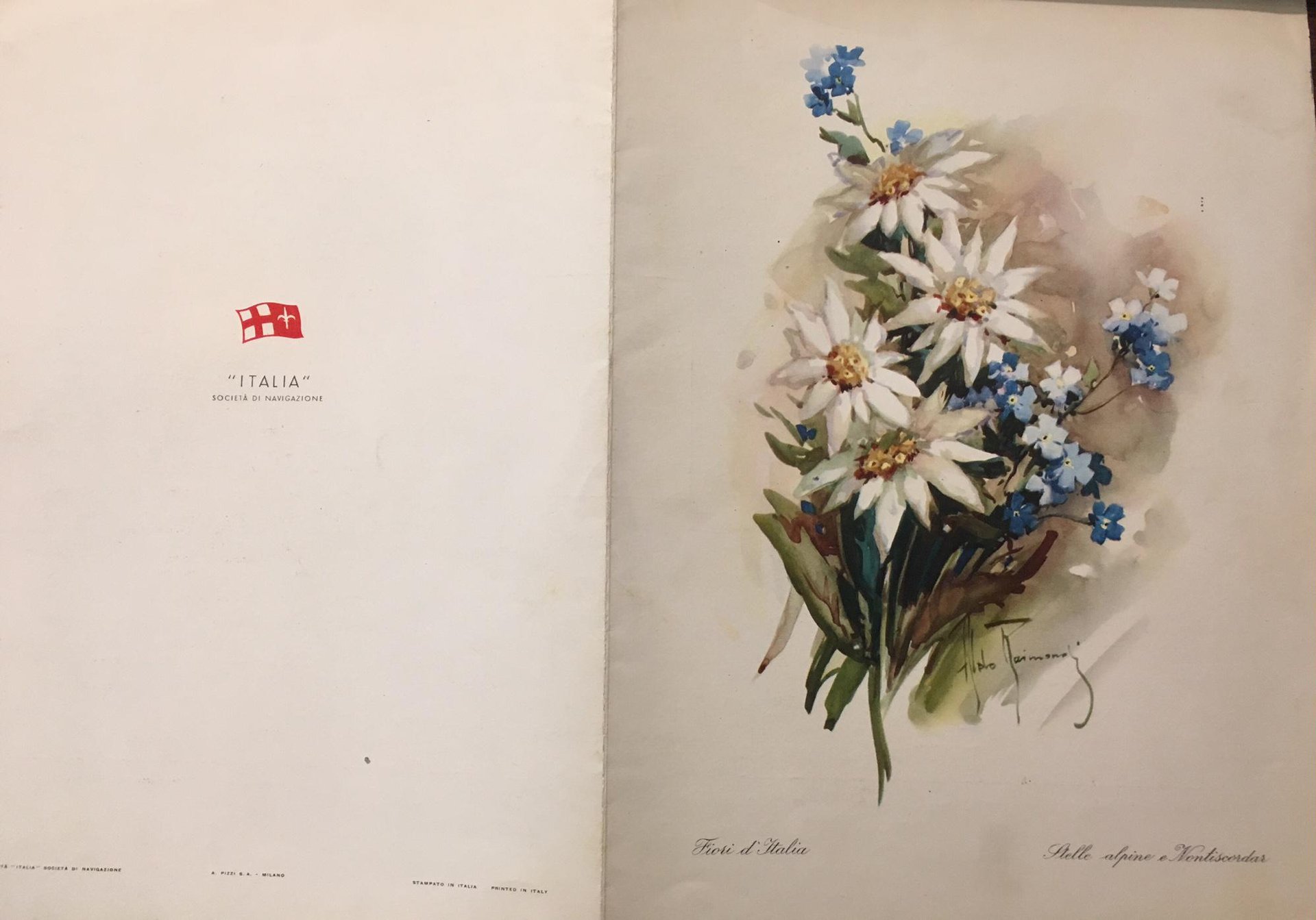 >Menù, 4 pp. mm. 320x235. sulla prima pagina un bouquet di stelle alpine e Nontiscordar di me firmato "Aldo Raimondi". All'interno il menù di Prima classe, in lingua italiana e francese, del Piroscafo T/n "Conte Grande" per il giono "Giovedi 21 Giugno 1951. Sull'ultima facciata il logo della Società di Navigazione "Italia".