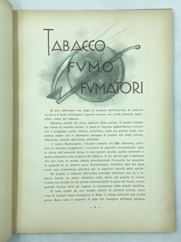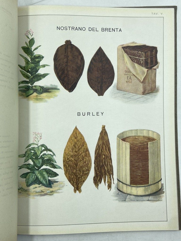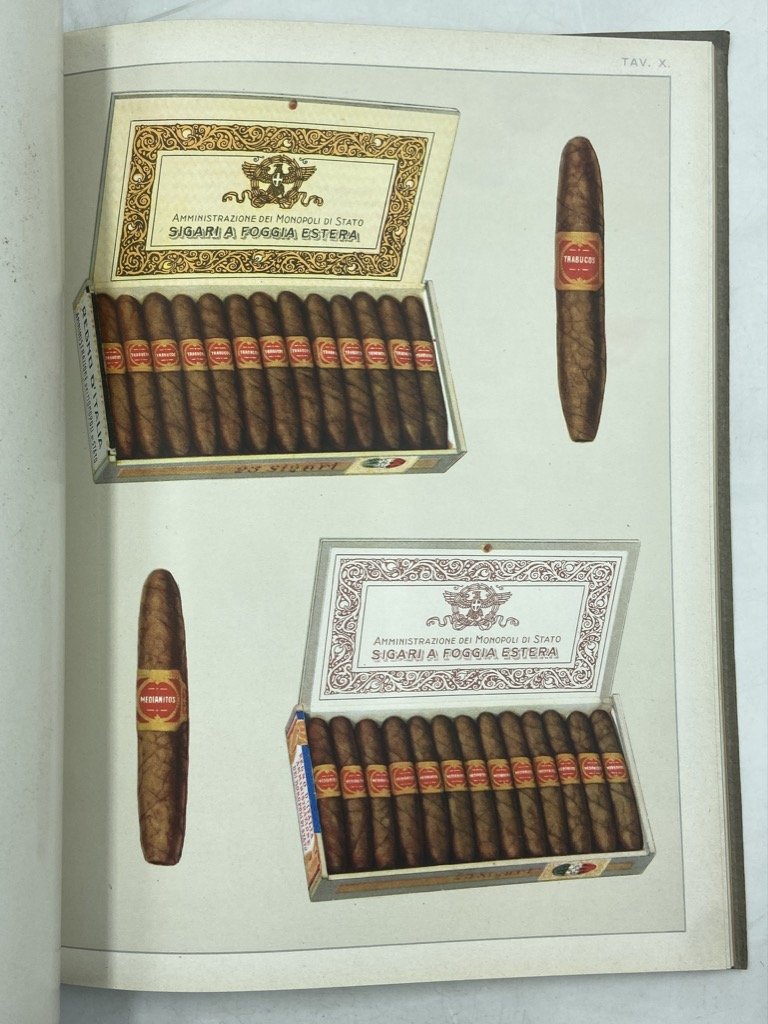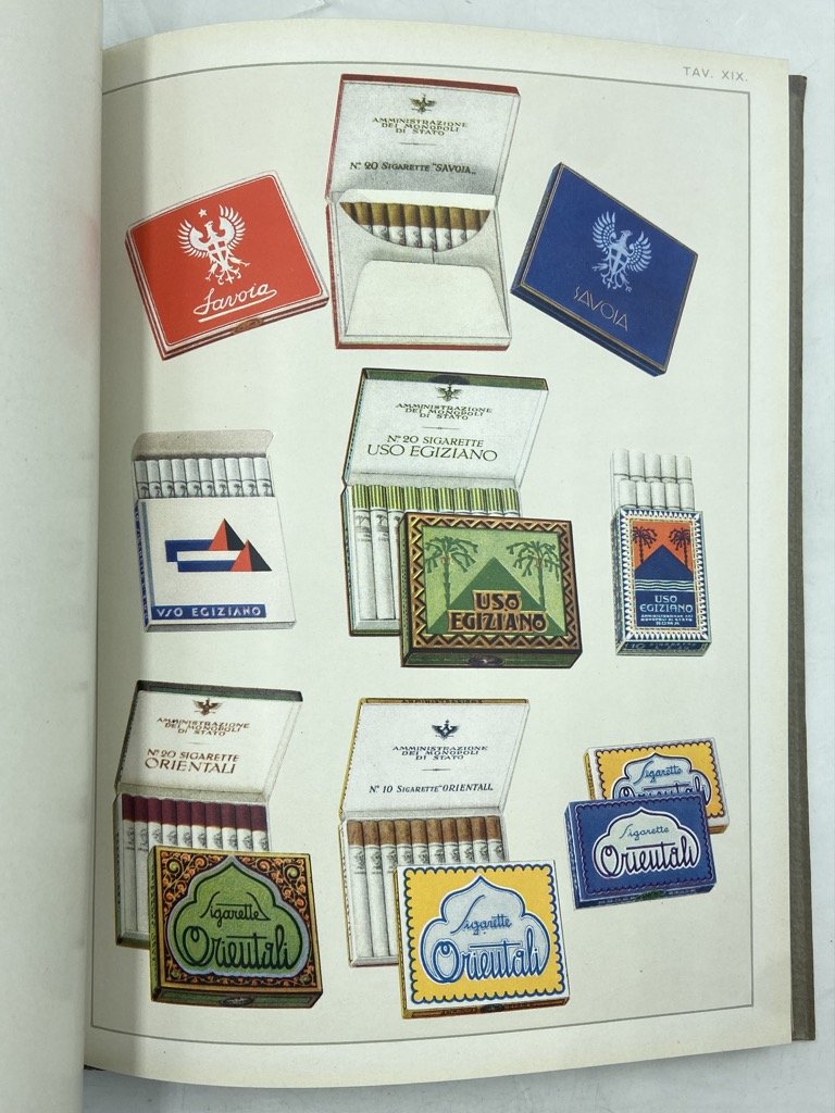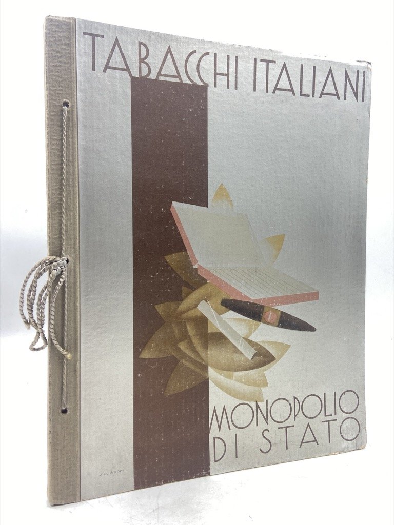 Brossura editoriale illustrata con legaccio, piatto anteriore argentato, cm 22x28, pp 20 (2), 5 tavole in nero (rotocalco) e diverse figure in nero nel testo, XXXVII (+1) tavole a colori con 11 pagine di testo esplicativo (solo recto), 24 pagine pubblicitarie in carta arancio, 1 carta di colophon. Ottimo stato di conservazione. Bel catalogo dei tabacchi italiani, pubblicato dai Monopoli di Stato nel 1934. Un articolo introduttivo intitolato "TABACCO FUMO FUMATORI" è illustrato da numerosi disegni in nero nel testo di Amos Scorzon (che firma anche la copertina) e da 5 tavole in rotocalco con ritratti fotografici di celebrità dell'epoca con loro citazioni sulle sigarette italiane; seguono alcune pagine sulle realizzazioni del Monopolio dei Tabacchi, con immagini dei magazzini di Verona, manifatture di Lucca e Venezia, e tabelle di vendita. Le tavole a colori raffigurano piante e foglie delle diverse varietà dei tabacchi italiani (Abruzzi Aromatico, Lanciano Valle, Lecce Yakà, Lecce Valle, Maryland Benincasa, Bright Italia, Kentucky, Beneventano, Nostrano del Brenta, Burley, Spadone di Chiaravalle, Erbasanta), confezioni per le manifatture, e notizie sull'introduzione e sperimentazione della coltura; seguono numerose tavole con le confezioni dei sigari, sigarette, tabacchi da fiuto, trinciati ecc; in fine una tavola pubblicitaria a colori del Consorzio Industrie Fiammiferi e alcune pagine pubblicitarie su carta arancio.