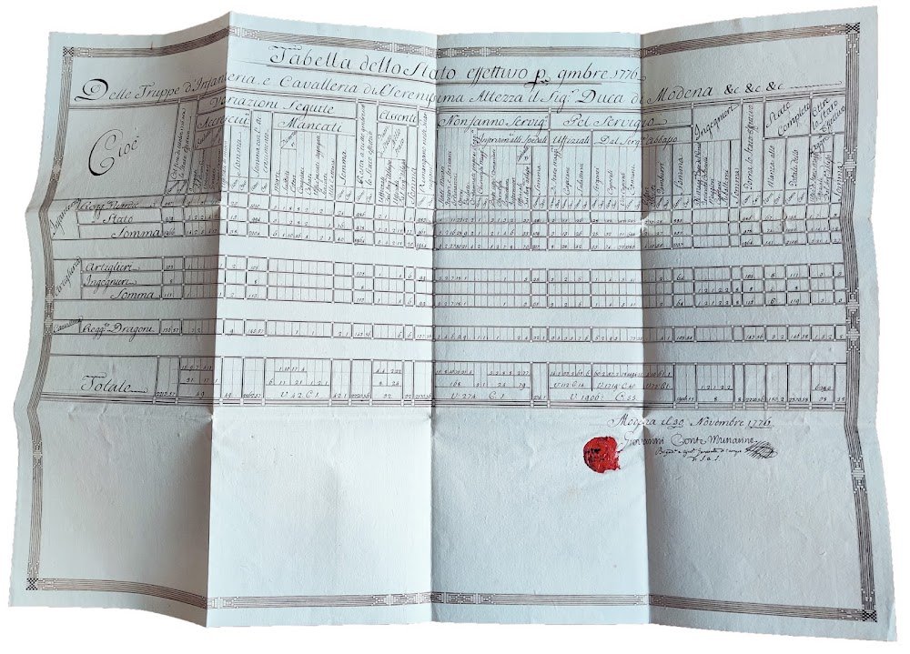 Tabella dello stato effettivo per 9mbre 1776 delle Truppe d'Artiglieria, e Cavalleria di S. Serenissima Altezza il Sig. Duca di Modena &c. &ec. &c. Modena, 30 novembre 1776. Manoscritto su carta
