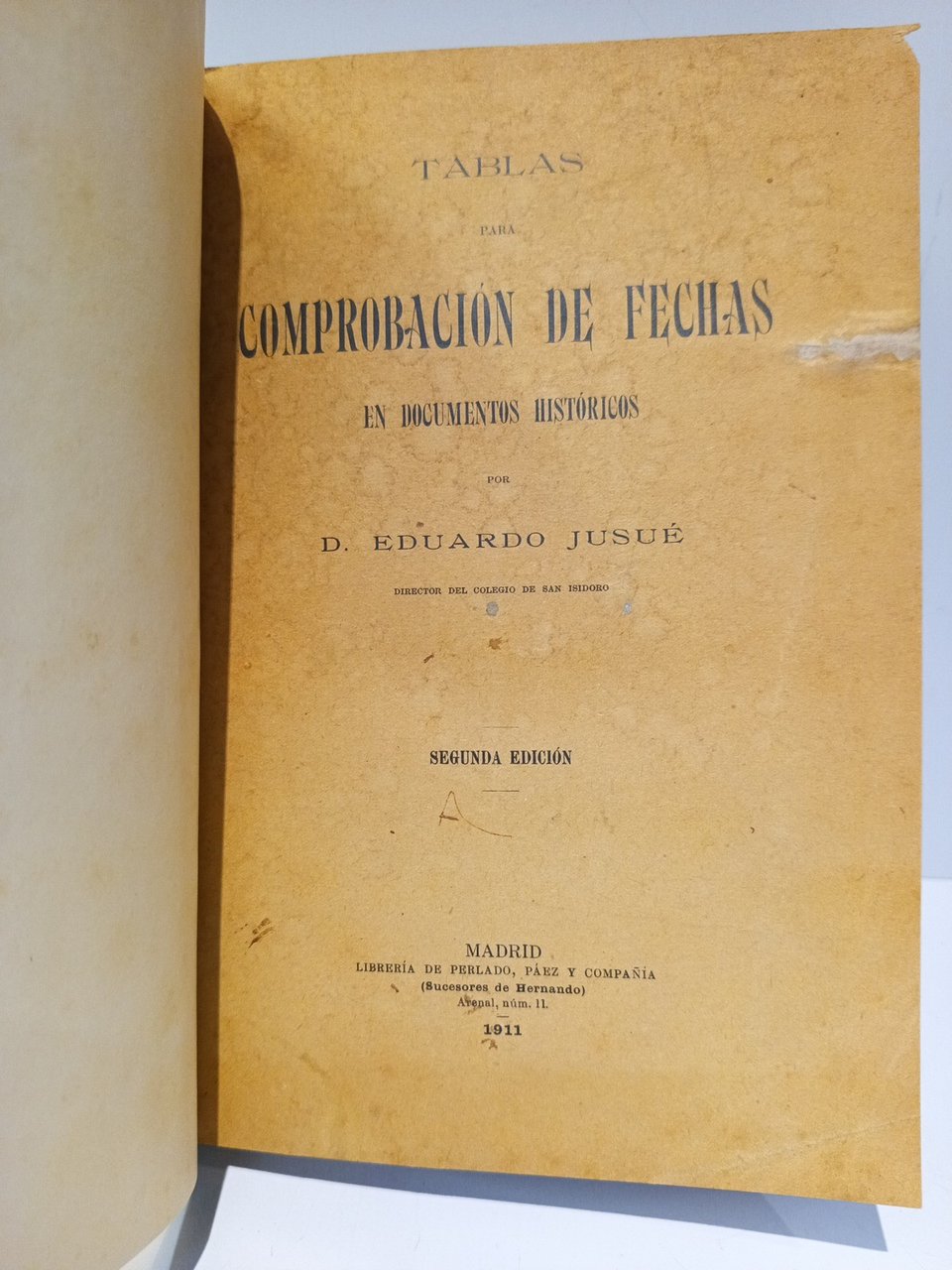 2ª Ed.- Madrid: Libr. de Perlado, Páez y Compañía, 1910 (en cubierta 1911).- 264 p: Tablas y estados; 4º (24,7 x 17,2 cm); Enc. en Media Piel, lomo cuajado, florones y cinco nervios, corte superior tintado, conservando ambas cubiertas originales.* La portada falta de su mitad superior, que se ha restaurado con una hoja de época en blanco. La información que falta se encuentra en la cubierta anterior. RELOJES, CRONOLOGÍA, CALENDARIOS, ALMANAQUES.