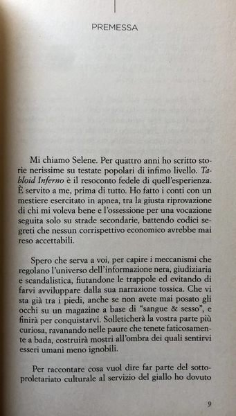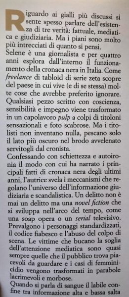 Most talked about the yellow we often hear about the existence of three truth: factual, judicial and media. But the plans are far more intertwined than people think. Selene is a journalist and for four years explore from within the workings of crime in Italy. As a freelance tabloid series zeta discovers the country he lives in (and herself) many things he would rather ignore. Any piece written with awareness, sensitivity and commitment is turned into a sensational headlines and photo shots masterpiece rough pulp. But the professional titlists do not invent anything, catching only the darker side in broth poisoned dunk from the reporter. Confessing with directness and irony the way he narrated the essential facts about criminals in recent years, the author reveals the mechanisms governing the universe of judicial information and the tabloid press. A crime is never a crime but a novel fiction that develops over time, as a soap opera or a television series. Standardized characters prevail, the fairy code and abuse of the twist. Victims who bore the threshold of media attention are almost always the ones that the audience is pleasant to look at and cases of femicide are transformed into parables Lachrymose and morbid.