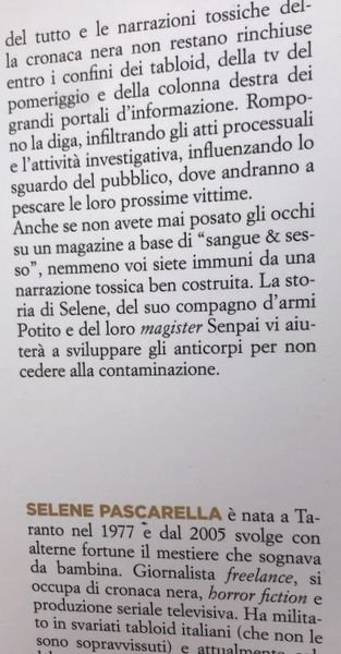 Riguardo ai gialli più discussi si sente spesso parlare dell’esistenza di tre verità: fattuale, mediatica e giudiziaria. Ma i piani sono molto più intrecciati di quanto si pensi. Selene è una giornalista e per quattro anni esplora dall'interno il funzionamento della cronaca nera in Italia. Come freelance di tabloid di serie zeta scopre del paese in cui vive (e di se stessa) molte cose che avrebbe preferito ignorare. Qualsiasi pezzo scritto con coscienza, sensibilità e impegno viene trasformato in un capolavoro pulp a colpi di titoloni sensazionali e foto scabrose. Ma i titolisti non inventano nulla, pescano solo il lato più oscuro nel brodo avvelenato servitogli dal cronista. Confessando con schiettezza e autoironia il modo con cui ha narrato i principali fatti di cronaca nera degli ultimi anni, l'autrice svela i meccanismi che regolano l’universo dell’informazione giudiziaria e scandalistica. Un delitto non è mai un delitto ma una novel fiction che si sviluppa nell'arco del tempo, come una soap opera o un serial televisivo. Prevalgono i personaggi standardizzati, il codice fiabesco e l’abuso del colpo di scena. Le vittime che bucano la soglia dell’attenzione mediatica sono quasi sempre quelle che il pubblico trova piacevoli da guardare e i casi di femminicidio vengono trasformati in parabole lacrimevoli e morbose. Quando si parla di sangue il labile confine tra informazione alta e bassa salta del tutto e le narrazioni tossiche della cronaca nera non restano rinchiuse entro i confini dei tabloid, della tv del pomeriggio e della colonna destra dei grandi portali d’informazione. Rompono la diga, infiltrando gli atti processuali e l’attività investigativa, influenzando lo sguardo del pubblico, dove andranno a pescare le loro prossime vittime. Anche se non avete mai posato gli occhi su un magazine a base di “sangue & sesso”, nemmeno voi siete immuni da una narrazione tossica ben costruita. La storia di Selene, del suo compagno d'armi Potito e del loro magister Senpai vi aiuterà a sviluppare gli anticorpi per non cedere alla contaminazione.
