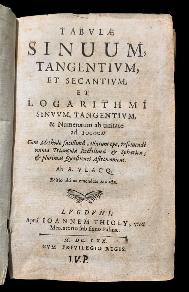 Tabulae sinuum, tangentium & secantium, et logarithmi sinuum, tangentium, & numerorum ab unitate ad 10000. Cum Methodo facillima, illarum ope, resolvendi omnia Triangula Rectilines et Sphaerica, et plurimas Quaestiones Astronomicas. ab A. Vlacq.,