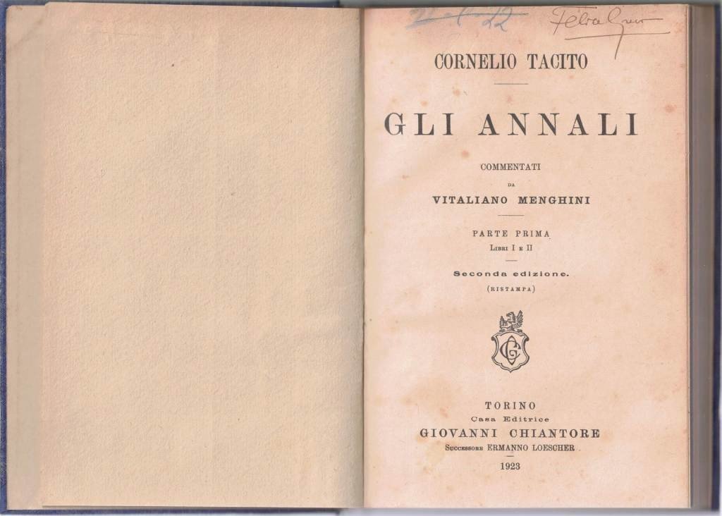 Gaio Cornelio Tacito (Gaius Cornelius Tacitus), Gli Annali, commentati da Vitaliano Menghini. Parte prima. Libri I e II, Casa Editrice Giovanni Chiantore Successore Ermanno Loescher, Torino 1923, seconda ed. (rist.), pp. XII, 175, cm 19, legatura coeva in mezza tela blu con titoli in oro al dorso e angoli. Testo in lingua latina con introduzione, commento e appendice critica in lingua italiana. Al frontespizio, firma d’appartenenza e segnatura di collocazione. Lievissime tracce d’uso alla legatura, qualche sporadico segnetto di lapis, minime fioriture, tenue brunitura della carta, per il resto bell’esemplare.