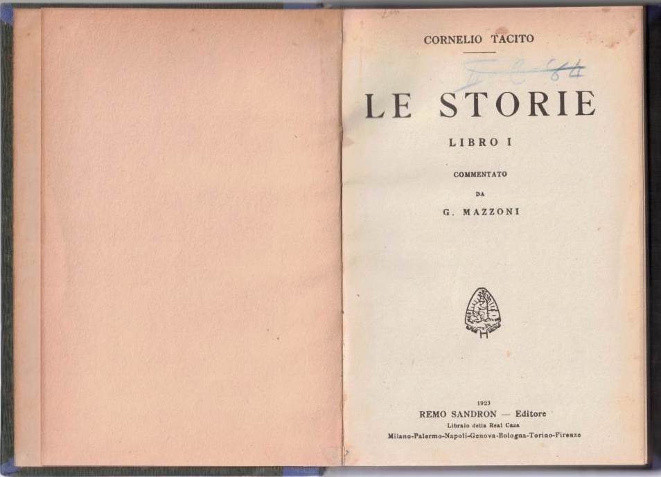 Publio Cornelio Tacito (Publius Cornelius Tacitus), Le storie. Libro I, commentato da G. Mazzoni, Remo Sandron Editore Libraio della Real Casa, Milano 1923, pp. XIV, 175, cm 19, legatura coeva in mezza tela blu con titoli in oro al dorso e angoli. Testo in lingua latina con introduzione e commento in lingua italiana. Segnatura di collocazione al frontespizio. Minime fioriture, leggera brunitura della carta, per il resto bell’esemplare.