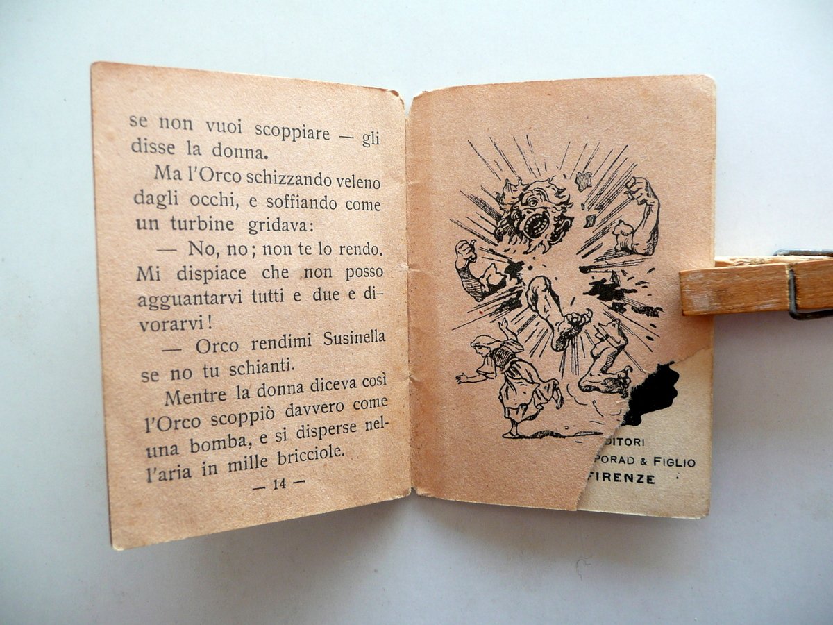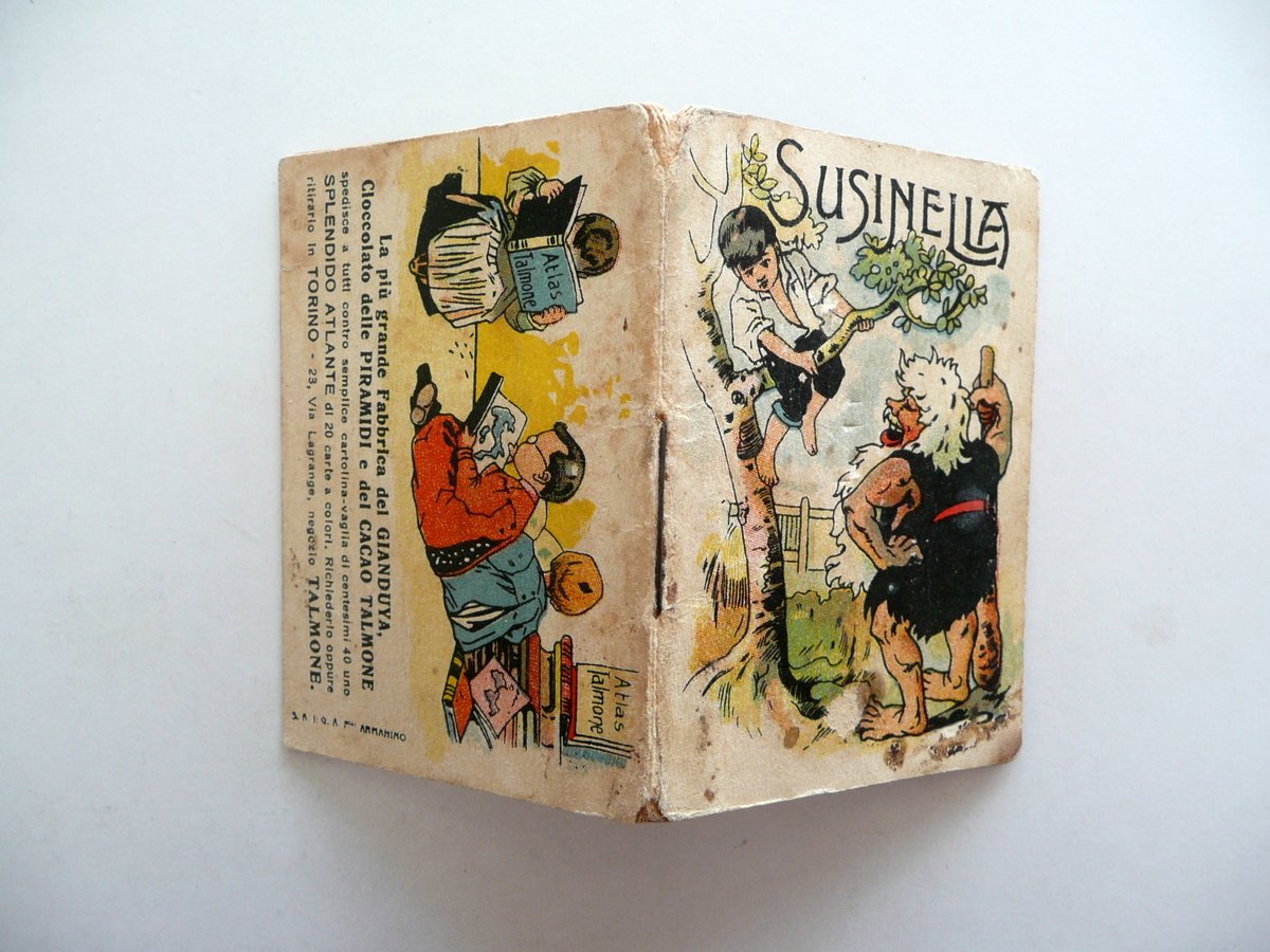 Ferruccio Orsi, Susinella - Serie dei raccontini" Realizzata dall'azienda dolciaria "Talmone" - Torino Edizioni Talmone ("Serie dei Raccontini"), Torino, s. d. (primo Novecento circa); cm 7x5, pp. 16 con 3 ill. in b/n fuori t.; brossura ed. con belle ill. a colori ad entrambi i lati. Condizioni di conservazione Esemplare in buone condizioni con tracce d'uso; brossure con alcuni piccoli leggeri aloni e qualche lieve macchietta; cuffie entrambe con una minuscola mancanza. Interni buoni; angolo inf. delle pp. 15-16 con una circoscritta mancanza e conseguente piccola perdita dell'immagine (vedi foto). SC03.D11091 N "