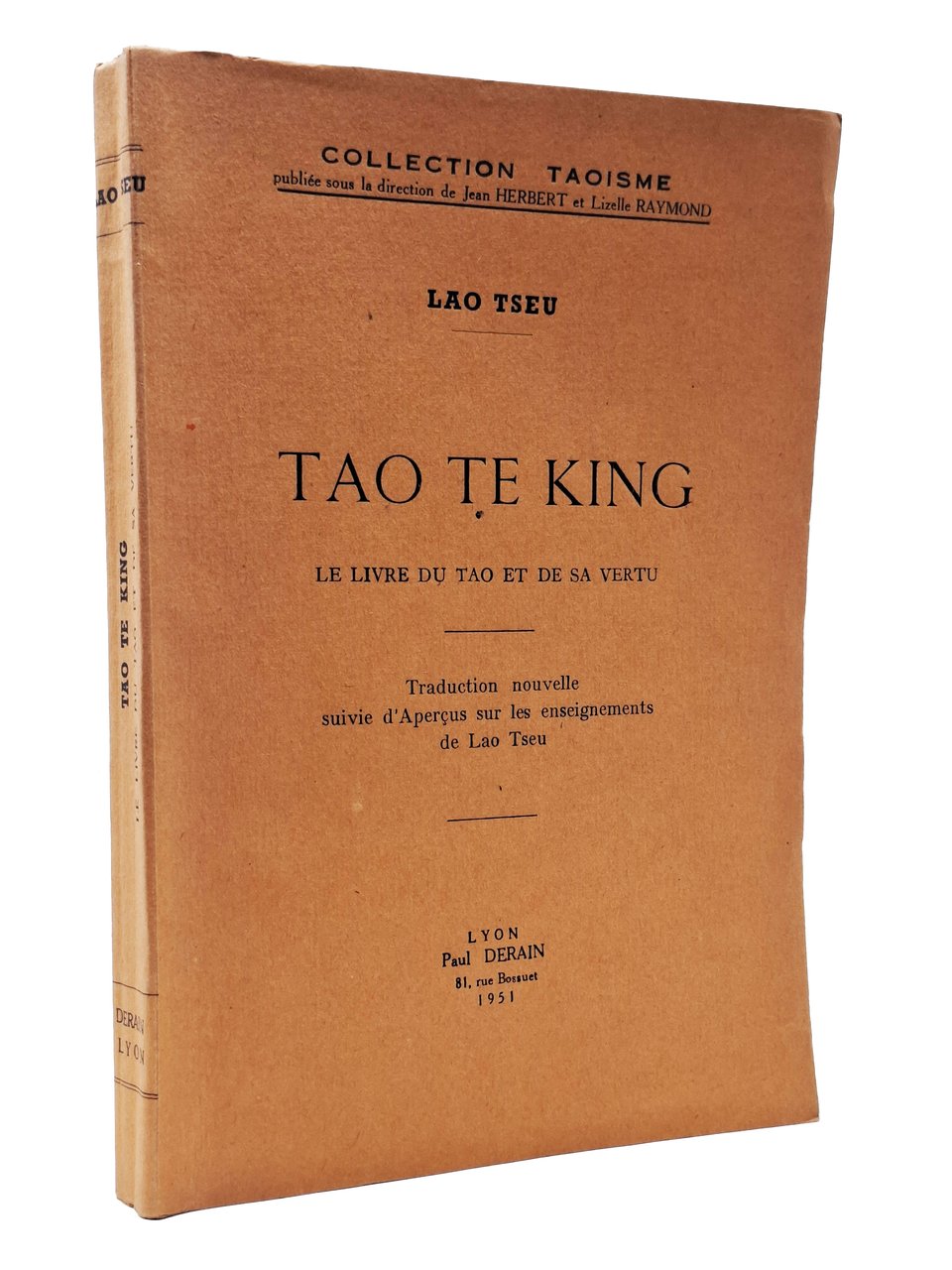 Traduction nouvelle suivie d'Apercus sur les enseignements de Lao Tseu. Collection Taoisme publiée sous la direction de Jean Herbert et Lizelle Raymond. Lingua del testo: francese. Pagine: 245 + [3]. Formato: 16 x 23,5 cm circa. Ottimo esemplare. Privo di timbri, firme d'appartenenza, sottolineature, annotazioni o altri segni nel testo. Copertina editoriale flessibile di colore arancione.