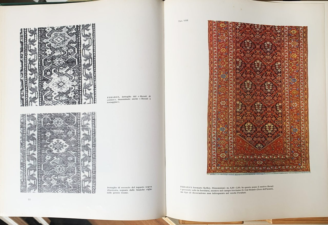 II ed. italiana (I ed: Milano, Vallardi 1959). VIII grande, 344, rilegatura in tela certa verde con titoli color oro entro tasselli neri. Con illustrazioni in b/n e colori, XL tavole illustrate a colori e una carta a colori ripiegata al fondo del volume (Luoghi d'origine dei tappeti orientali). Le foto sono per la maggior parte opera dell'Autore. Stato buono (manca la sovraccoperta - leggero uso della copertina ai margini - pagine ingiallite). Sommario: Prefazione - Parte generale (Origini del tappeto annodato - Il nodo - La lavorazione e i suoi strumenti - Il colore - I materiali - I formati - Decorazione e simboli - Classificazione e scelta del tappeto orientale - I difetti - Conservazione e manutenzione) - Classificazione (Tappeti di Persia - Tappeti del Caucaso - Tappeti dell'Asia Minore - Tappeti dell'Asia Centrale e Orientale) - Bibliografia - Indice analitico.