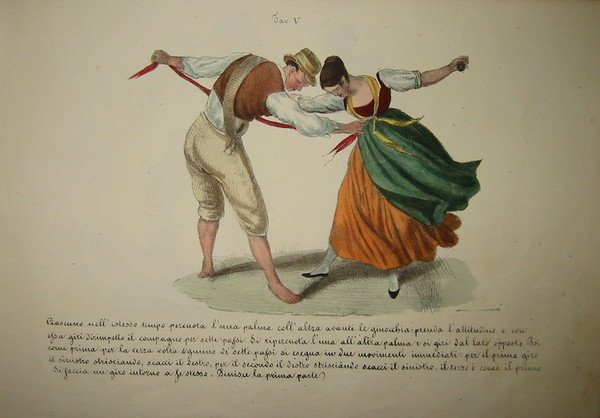 4to oblungo (cm. 18x25), frontespizio, una carta di musica e 20 tavole litografiche in splendida coloritura d’epoca, tutte raffiguranti (tranne la prima d’insieme) una coppia di ballerini che eseguono i movimenti e le posizioni della tipica danza popolare napoletana. Le tavole sono accompagnate da un testo esplicativo nella parte inferiore. Legatura coeva in marocchino rosso con fili e titolo impresso in oro al ds. Doppia cornice dorata con fleurons angolari ai piatti. Piccola mancanza alla cuffia superiore e minime tracce d’uso. Carte di guardia marmorizzate. Esemplare in ottimo stato di conservazione. Opera affascinante ed assai rara. Non presente in ICCU.