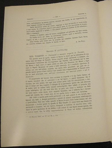 In 4? (cm 30), Brossura moderna in carta Varese, pagg. pagg. 8 (pagg. 318-325) con 1 fig. b.n. n.t. di uno dei pavimenti a mosaico, tratto dagli "Atti della R. Accademia dei Lincei Anno CCXCI 1894 serie quinta. Classe di scienze morali, storiche, filologiche Volume II Parte 2? - Notizie degli Scavi: Settembre 1894", buon es. Luigi Viola (Galatina, 1851 ? Taranto, 1924), condusse i primi scavi archeologici nel Borgo Nuovo di Taranto, ponendo le basi per la ricostruzione topografica della citt? in epoca antica; fond? inoltre il Museo nazionale archeologico di Taranto.