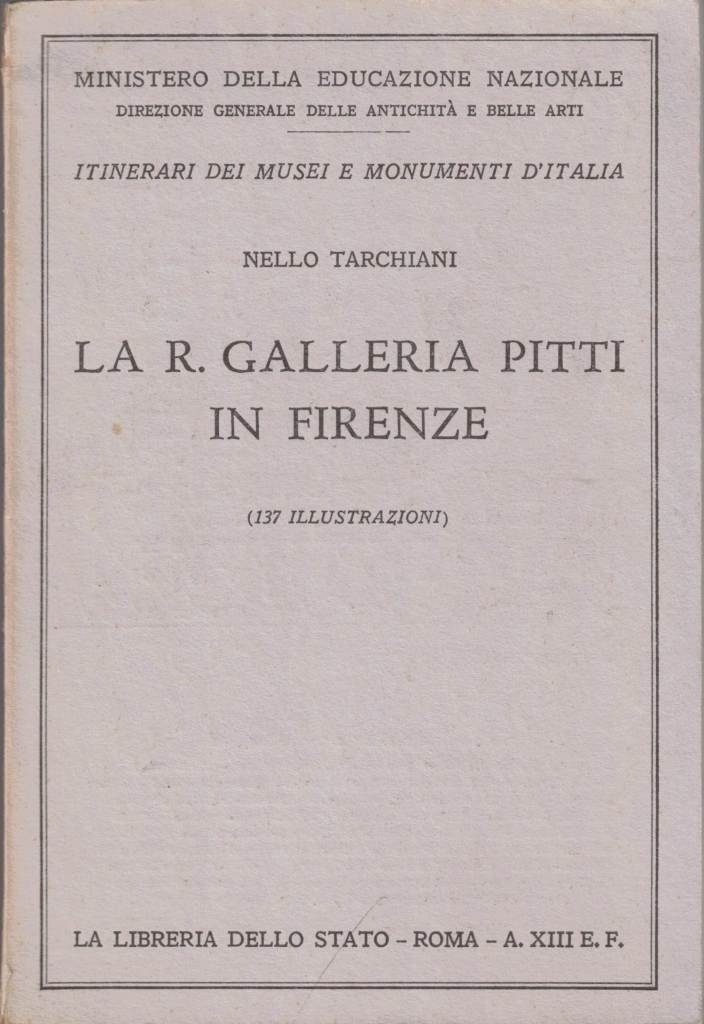 Nello Tarchiani, La R. Galleria Pitti in Firenze, La Libreria dello Stato, Roma 1934 XIII, pp. 77, ill. b.n., cm 18, br. ed. In testa al frontespizio: Ministero della Educazione Nazionale – Direzione Generale delle Antichità e Belle Arti. Collana Itinerari dei Musei e Monumenti d’Italia, n. 41. Piccola etichetta con prezzo alla terza di copertina. Minime tracce d’uso, per il resto ben conservato.