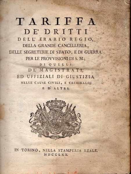Tariffa de' diritti dell'erario regio, della grande cancelleria, delle segreterie di stato, e di guerra per le provvisioni di S. M.; di quelli de' magistrati ed uffiziali di giustizia nelle cause civili, e criminali; e d'altri