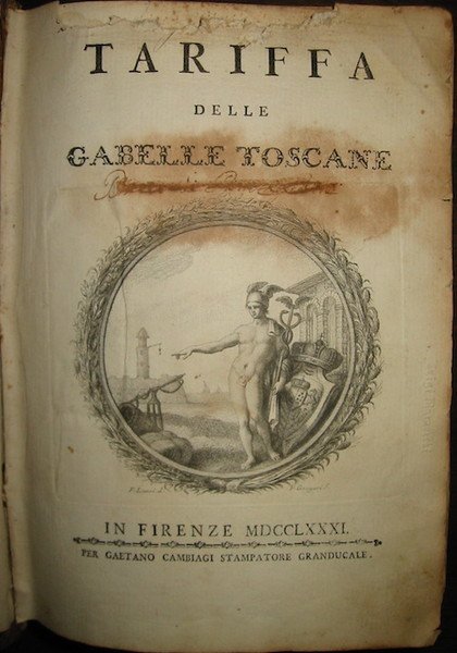 8vo (cm. 24,5 ), 1 c.nn., LVIII-44 pp., 271 pp. 216 pp., 2 cc.nn. Grande incisione calcografica al frontespizio di F. Gregori da un disegno di F. Lucci. Solida legatura coeva in mz. pelle con nervi e titolo manoscritto al dorso (piuttosto usurato). Piatti in legno. Macchia al frontespizio in corrispondenza della cancellazione di un’antica scritta di appartenenza, mancanza al margine superiore e un timbretto a secco sul margine bianco laterale. Tagli colorati. Nel complesso, a prescindere dal contenuto generalmente poco amato, esemplare affascinante. Prima edizione. Einaudi II, 5713.