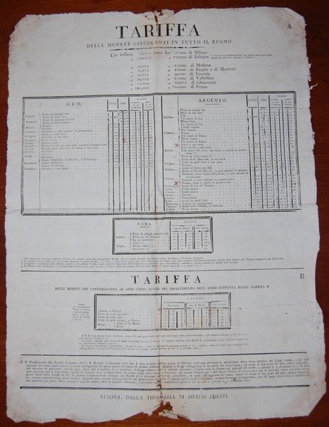 58x43,5 cm; folio volante. Pieghe nel foglio, difetto al margine basso del foglio in corrispondenza dello stampatore con carta rovinata all'altezza della lettera R di tipografia. Piccolo strappetto in corrispondenza della piega del foglio nel margine alto. Qulache leggerissimo, ininfluente alone e per il resto in buone condizini di conservazione. Interessantissimo foglio volante stampato a Verona che contiene una precisa descrizione di tutte le monete circoalnti nel "Regno" (lire Italiane di Milano, Bologa, Modena, Reggio e Mantova, Venezia, Valtellina, Chiavenna, Parma), il raffronto fra i vari titoli, pesi, e valore delle monete d'argento, di rame e d'oro italiane, francesi, milanesi, bolognesi, modenesi, veneziane, francesi, della Savoja, parmensi, genovesi, romane, tedesche, spagnole. In fondo la Tariffa delle monete che continueranno ad aver corso legale nel dipartimento dell'adige estratta dalla tariffa B (Lirazza Petizza Trairo, Soldo di S. Marco, Bezzo). ASSAI RARO.
