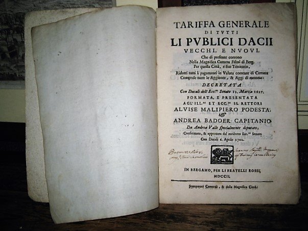 Tariffa generale di tutti li publici dacii vecchi, e nuovi, che di presente corrono nella Magnifica Camera Fiscal di Bergamo per questa Città, e suo Territorio, ridotti tutti li pagamenti in Valuta corrente di Camera comprese tutte le Aggionte, & Aggi di moneta. Decretata con Ducali dell'Ecc.mo Senato 13 Marzo 1697 formata, e presentata agl'Ill.mi et Ecc.mi SS. Rettori Alvise Malipiero Podesta & Andrea Badoer Capitanio. Confermata, & approvata dal medemo Ecc.mo Senato con Ducali 6 Aprile 1702