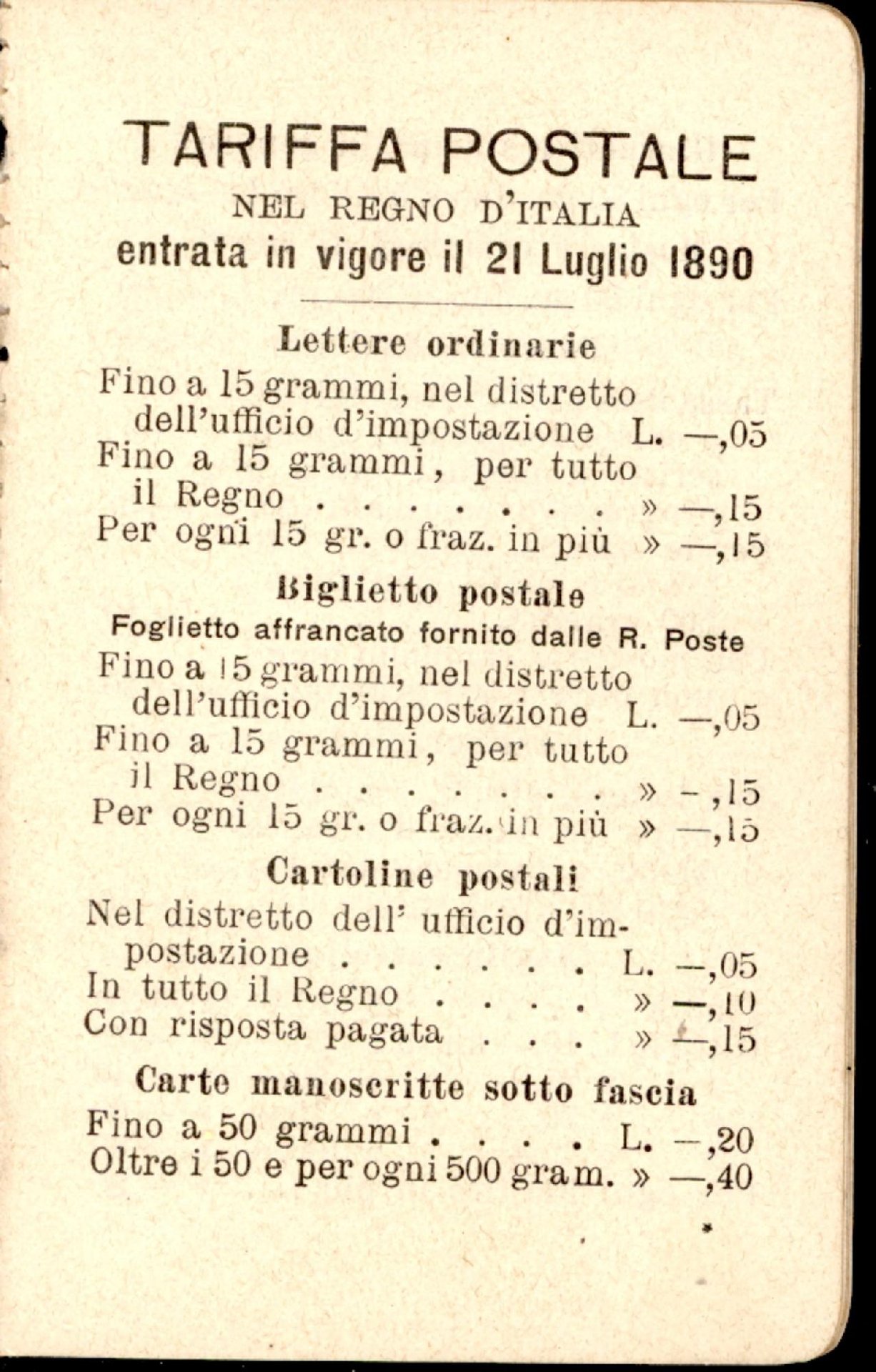 Tariffa Postale nel Regno d'Italia entrata in vigore il 21 luglio 1890