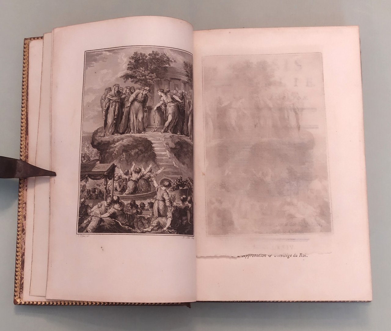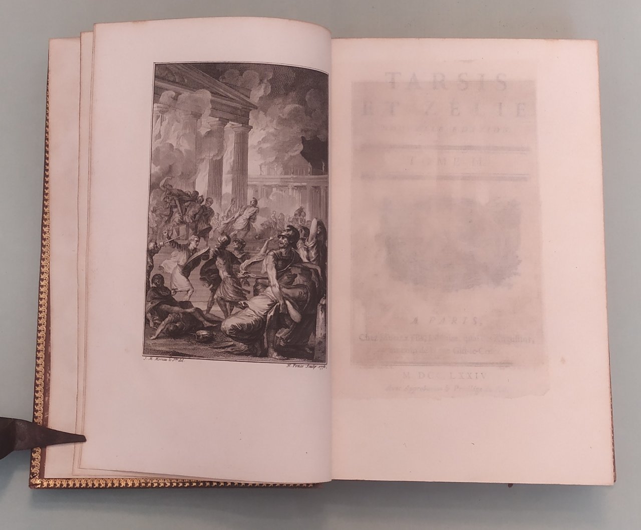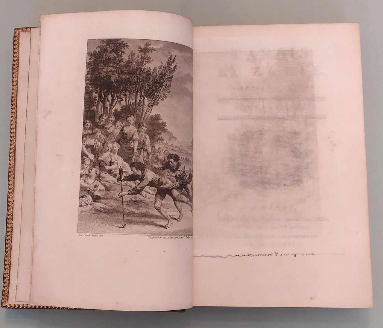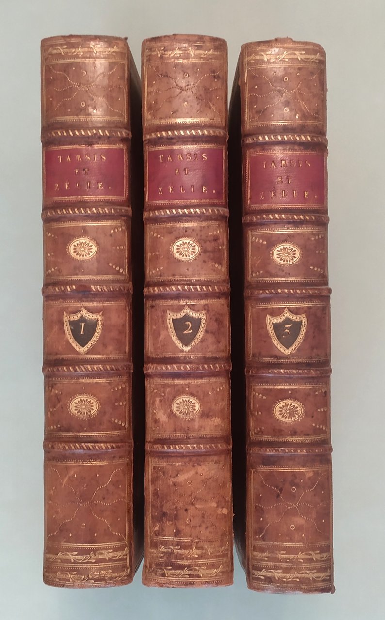 A Paris, chez Musier fils, 1774. 3 volumi in 8vo (cm.23x16); pp.IV, XXIII, 563, cc. 2n.nn; 563; 597. Tre antiporte di Cochin, Moreau e Eisen incise da Gaucher, Ponce e Nèe. Tre vignette ai frontespizi e 20 vignette all’inizio di ciascun libro di Eisen incise da Helman, de Longueil, Masquelier, Massard, Nèe e Ponce. Legatura coeva in bazzana marmorizzata. Dentelles e fregi dorati ai piatti. Dorso a cordoni, tassello con titoli e fregi in oro. Tagli marmorizzati. Esemplare nitido. L’autore, famoso giureconsulto seicentesco e intendente dei Sassoni, pubblicò anonimo questo romanzo pastorale. La bellezza dei disegni e la delicatezza delle incisioni rendono questa edizione più rinomata delle precedenti, l'unica citata da Cohen, 643.