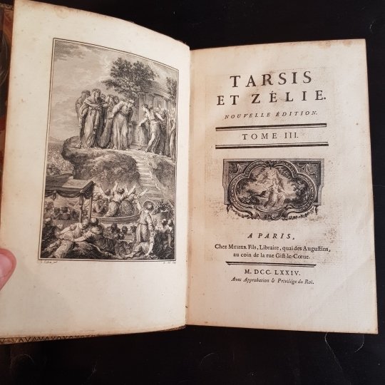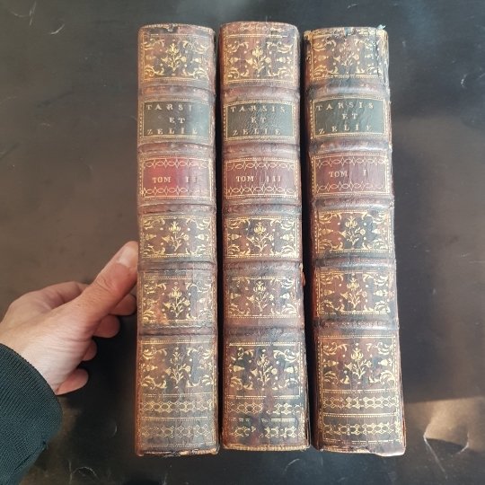 3 voll. in-8°, pp. IV, XXIV, 564; (2), 564; (2), 597, 2 (su 3) antiporte di Cochin, Moreau e Eisen incise da Gaucher, Ponce e Nèe, 20 deliziose incisioni a mezza pagina ad inizio di ogni libro di Eisen incise da Helman, de Longueil, Masquelier, Massard, Nèe e Ponce. Bella legatura coeva in piena pelle marezzata, dorso a cinque nervi con titolo su tassello e fregi in oro, ai piatti triplice cornice lineare in oro, tagli dorati. Mancanza alle cuffie e agli angoli, usure alle cerniere.
