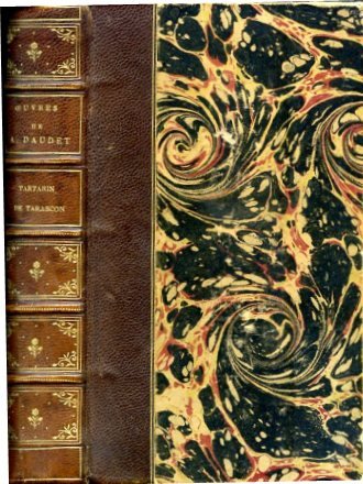 In-16°, pp. (6), 260, (6), attraente legatura coeva m. pelle marrone con titolo, filetti, fiorellini e motivi vegetali in oro entro scomparti su dorso a nervetti. Piatti marmorizzati, taglio di testa dorato, sguardie pavonate, segnacolo. Fregi tipografici. Perfetto esemplare. Raffinata edizione del primo volume della trilogia in cui Daudet narra le gesta eroicomiche del suo immortale personaggio, pubblicato in Francia nel 1872. 'In ogni francese c' è un pizzico di Tarascona', diceva lo scrittore a proposito del proprio eroe, assurto a celebrità proverbiale come prototipo del meridionale fanfarone ed iperbolico, al punto che Tarascona gli ha dedicato un museo, ricreando in tutto e per tutto la casetta del baobab così come la descrive vividamente Daudet. 'Nervoso e vivace, animato da un capo all'altro dalla gioiosa fantasia e dal colorito e scintillante stile del miglior Daudet, esso rivela, sotto l'apparenza burlesca, tutto il commosso amore dell'autore per la sua gente e per la sua terra' (Mario Bonfantini in Diz. Bompiani d. Opere, VII, 341). 'Tartarino è diventato il Don Chisciotte francese' (Albert Thibaudet). L'eroe di Daudet è stato protagonista di numerose trasposizioni cinematografiche, la prima delle quali ad opera di Georges Meliès.