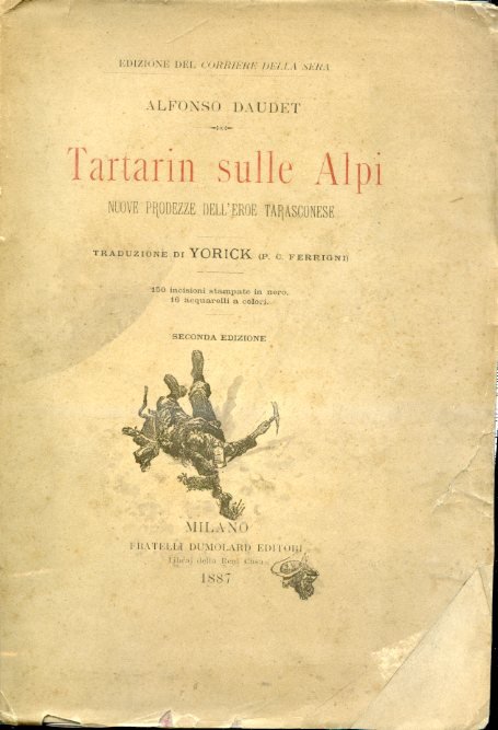 In-8°, pp. 296, (2), brossura editoriale con titolo in rosso e nero e piccola vignetta. Ritratto del Daudet all'antiporta, da un acquerello di Rossi. 150 gradevoli illustrazioni intercalate n.t. e 16 acquerelli f.t. di Aranda, de Beaumont, Monténard, de Myrbach, Rossi. Gli angoli inferiori esterni dei piatti sono ricostituiti. Bella copia in barbe. Seconda edizione italiana (7° migliaio), contemporanea alla prima, nella traduzione di di Yorick (Pietro Coccoluto Ferrigni), del fortunatissimo romanzo di Daudet, innumerevoli volte ristampato, seguito del 'Tartarin de Tarascon' e uno dei più felici romanzi di ambientazione alpina, garbata e spiritosa satira dell'endemica moda escursionistica dell'Ottocento. L'edizione originale francese era apparsa nel 1885. Perret, 1216: 'Un célèbre roman humouristique, qui est une satire du tourisme dans les Alpes, mais comporte de belles évocations des paysages alpins'. Crivellato, 'Catalogo rassegne int.li editoria di Montagna', 1996: 'Classico della letteratura umoristica, è dimostrazione dell'enorme popolarità della moda dell'alpinismo. Daudet non è un alpinista, ma è scrittore così documentato ed efficace da sembrarlo'. Per l'ediz. orig. francese, Alpine Club Library, p. 83; Angelini, 950; Mathews, p. 302; 'Schweizer Alpen-Club', p. 302; Vicaire, III, 57-58 e Carteret, I, 197.