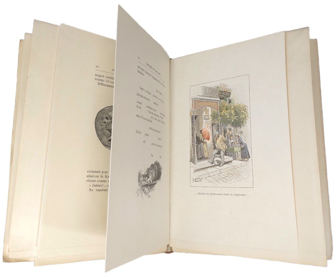 >in-8, pp. (4), 334, (8), pregevole leg. coeva in m. marocch. rosso, titolo in oro al dorso, copertine edit. illustrate originali conservate, in antiporta ritratto dell'autore, ornato da un gran numero di illustrazioni e 16 acquerelli a colori n.t. eseguiti dagli artisti citati nel titolo. Prima edizione, prima tiratura (Imp. A. Lahure), assai raro, uno dei soli 100 esemplari tirati su carta giappone e con il ritratto dell'autore, "Le premier tirage se reconnait à ce que les exemplaires ne portent aucune indication de justification du tirage de luxe" (Carteret, I, 197). Le vignette in bianco e nero, ma soprattutto le tavole a colori, risaltano con una brillantezza e una luminosità eccezionali sulla carta giappone. Celebre e fortunato romanzo umoristico del brillante scrittore provenzale (1840-1897), intelligente satira della "inarrestabile ascesa del turismo e della frequentazione delle località alpine alla moda" (Garimoldi), osservate dal Daudet nei due viaggi in Svizzera e Savoia del 1883 e 1885. Esemplare molto bello, ad ampi margini, impresso su carta giappone a fogli diseguali, numerosi dei quali ancora chiusi. Perret 1216: «L'édition originale est recherchée». ACL 83. Mathews 302. Garimoldi n. 100. Carteret, I, 197.