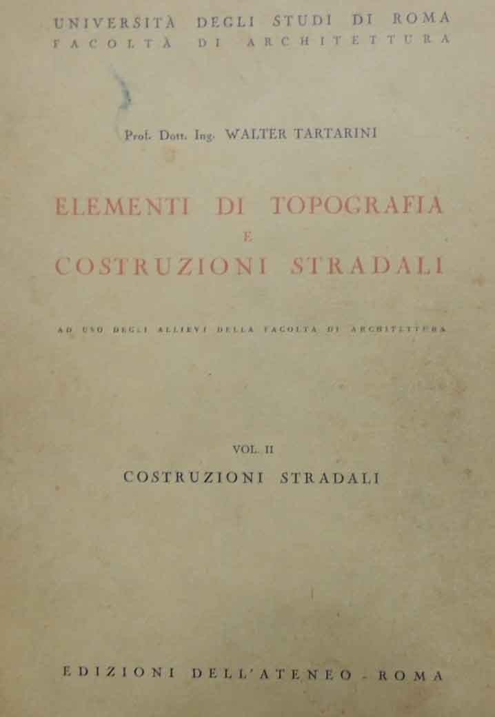 Walter Tartarini, Elementi di topografia e costruzioni stradali ad uso degli allievi della Facoltà di Architettura. Vol. II. Costruzioni stradali, Edizioni dell’Ateneo, Roma pp. 212. Ill. b.n., cm 24, br. ed. In testa al frontespizio: Università degli Studi di Roma – Facoltà di Architettura. Dattiloscritto ciclostilato. Firma d’appartenenza al frontespizio. Tracce d’uso, alcune sottolineature e annotazioni a pastello e lapis, minime fioriture, uniforme brunitura della carta, ma nel complesso copia in condizioni accettabili e perfettamente fruibile.