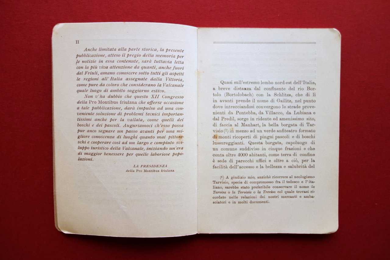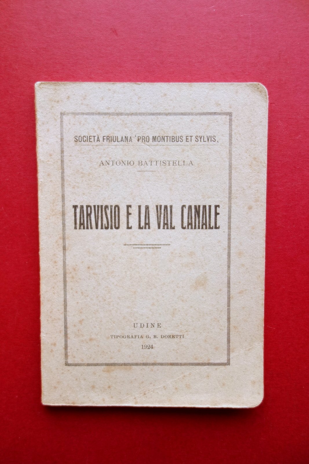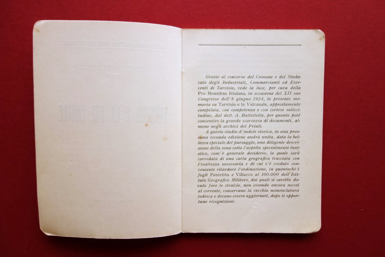 Antonio Battistella, Tarvisio e la Val Canale Tip. G. B. Doretti, Udine 1924; cm 15,5x11; pp. 48-[12; inserzioni pubblicitarie]. Brossura ed. Condizioni di conservazione Esemplare in buone condizioni con tracce d'uso; brossura con piccole leggere bruniture. Interni buoni. Raro. OPEB.4928 N