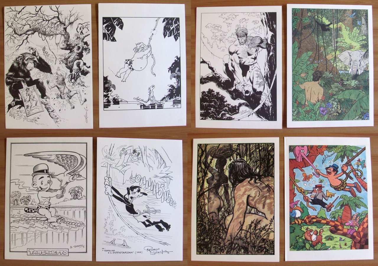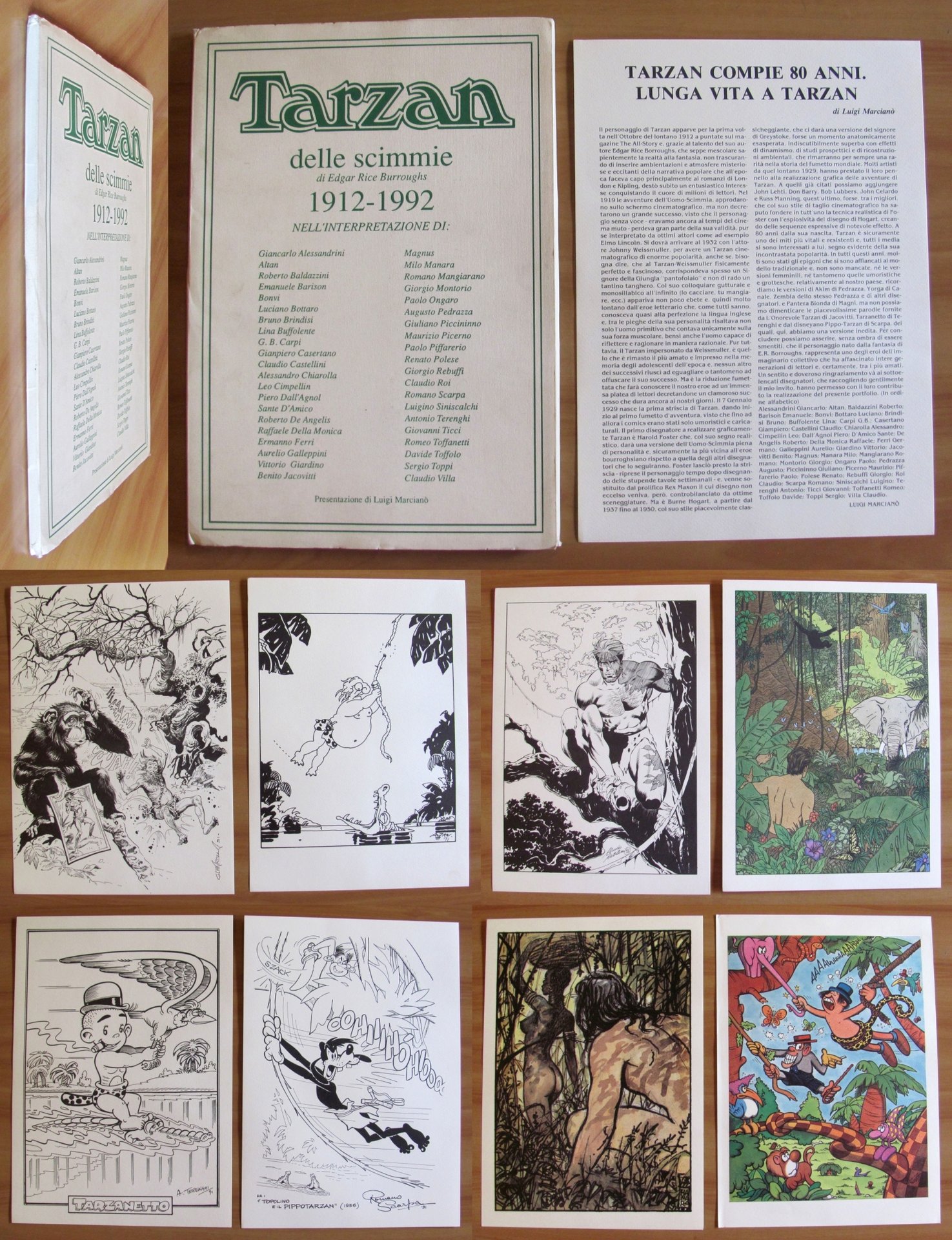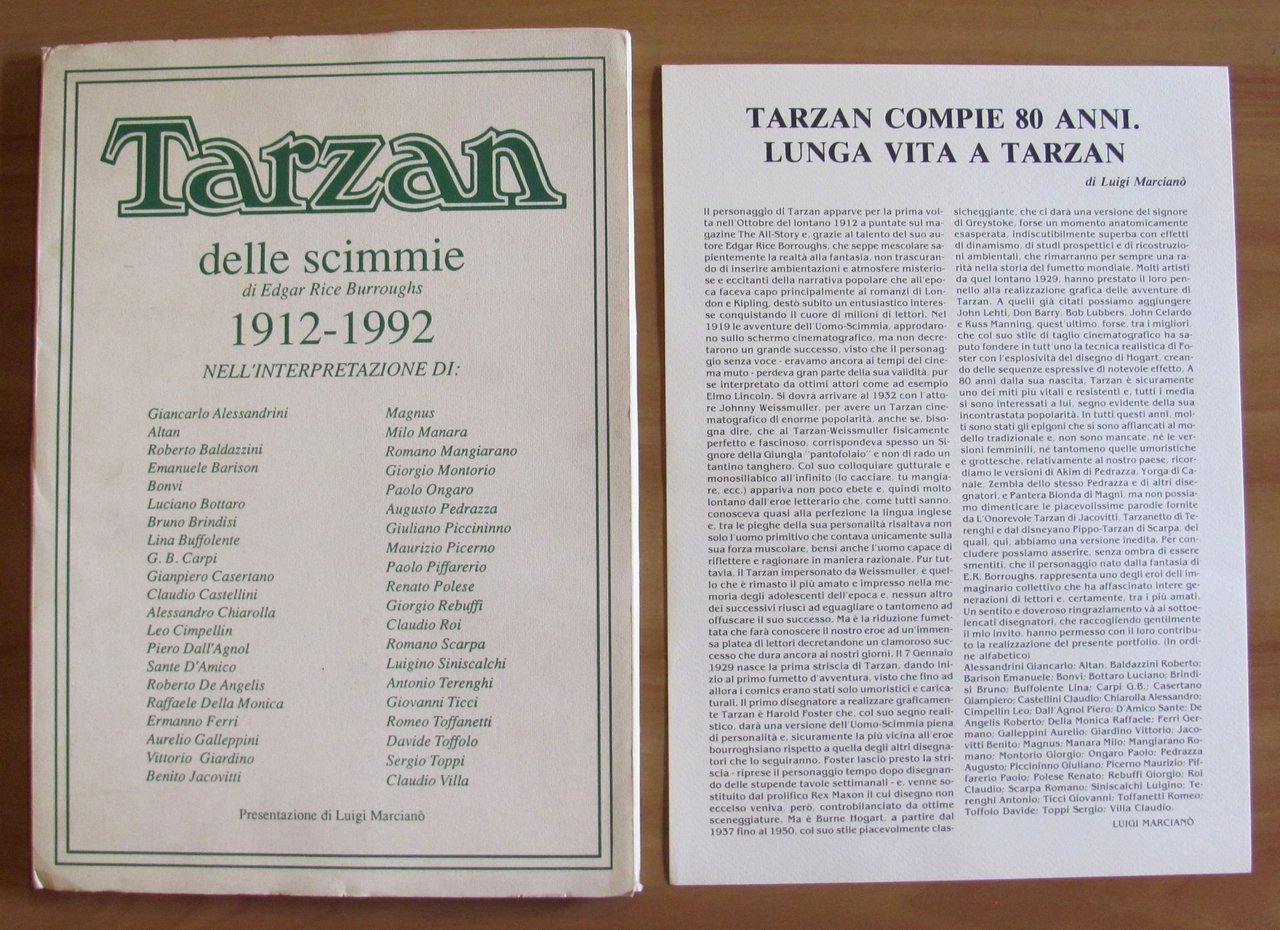 Presentazione su tavola sciolta di Luigi Marcianò. Tarzan delle Scimmie 1912-1992 con 41 tavole sciolte dei 41 diversi grandi illustratori, riportati in copertina, da Alessandrini a Villa, nella loro personale interpretazione di Tarzan. Portfolio formato da cartella editoriale contenente 42 tavole. 26x36,5 la cartella e 25x35 ciascuna tavola. Ottimo stato. , Ottimo (Fine)