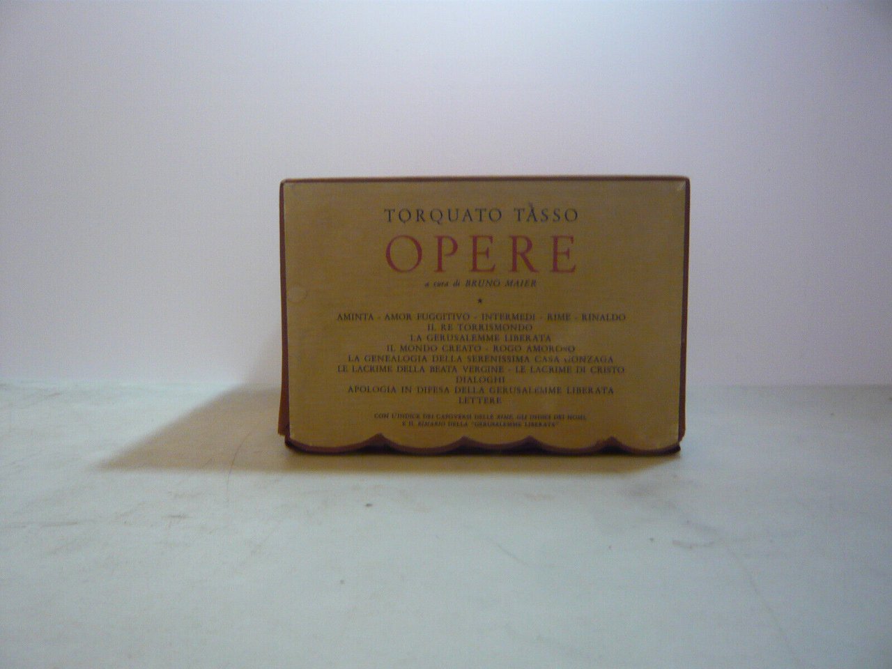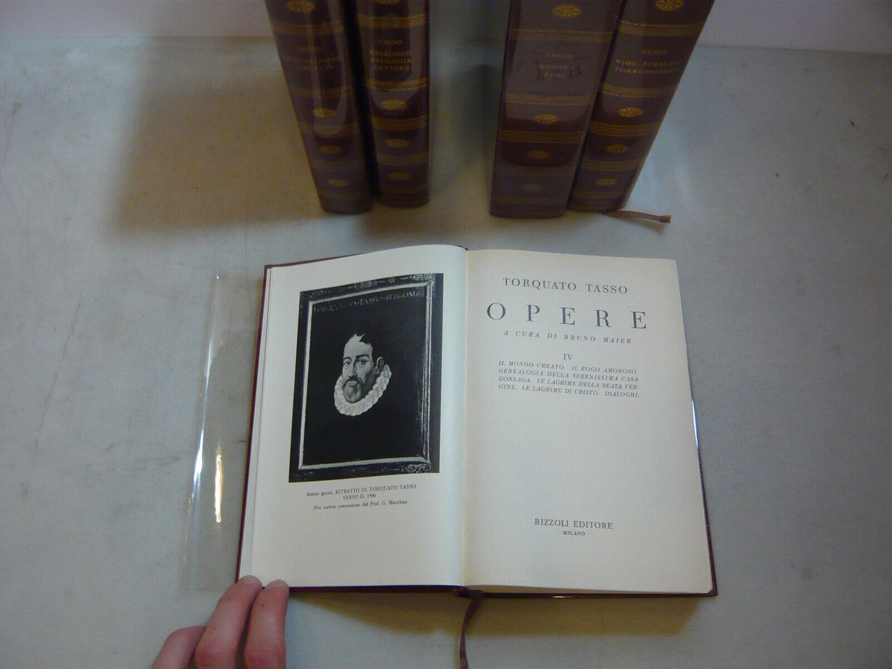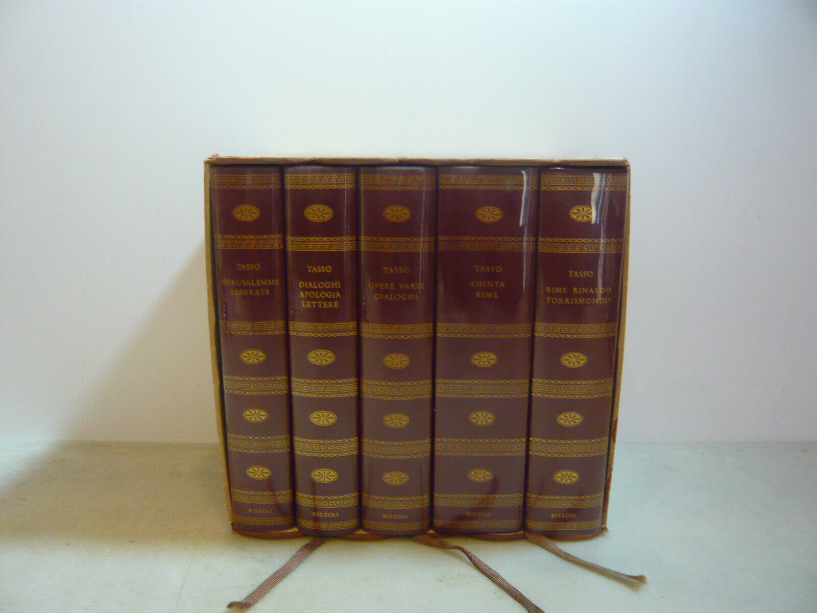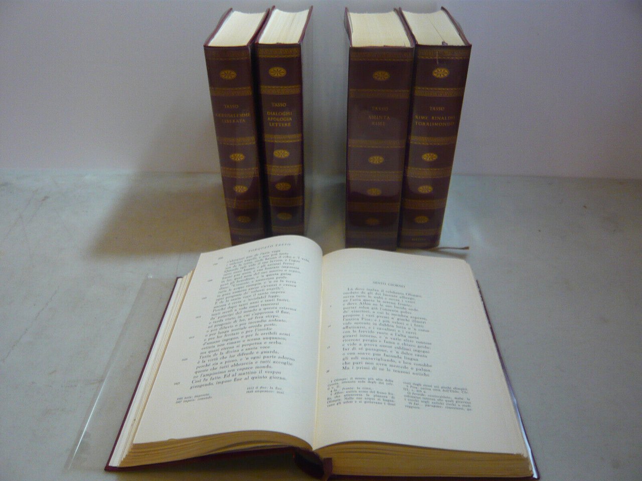 5 volumi: "Gerusalemme Liberata"; "Dialoghi, Apologia, Lettere"; "Opere Varie, Dialoghi"; "Aminta, Rime"; "Rime, Rinaldo, Torrismondo".