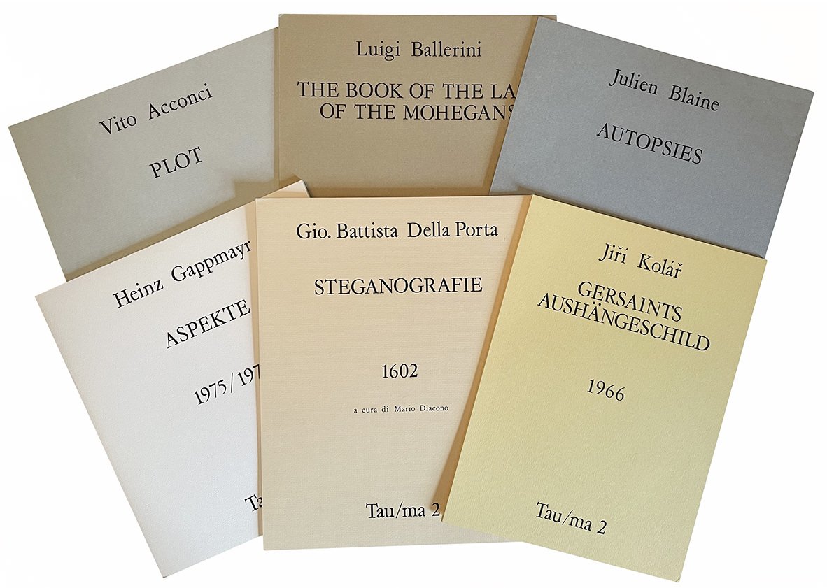 Secondo numero della rivista Tau/Mai in sé completo. Scatola di cartone rigido (mm. 303x215) contenente sei pamphlet rilegati, che costituiscono i testi e i documenti del numero. Al piatto anteriore della scatola sono indicati in verde e in nero il titolo, la numerazione e l'anno di pubblicazione. Mancanze agli angoli e lungo le piegature della scatola, restauri marginali.