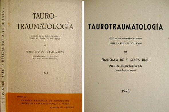 Bilbao, Talleres Tipográficos de la Editorial Eléxpuru Hermanos, 1945. 4to.mayor; 129 pp., 1 h., con ilustraciones fotográficas y dibujos entre el texto. Cubiertas originales. El autor, experto en el tema, era Médico Jefe del equipo quirúrgico de la Plaza de Toros de Valencia.