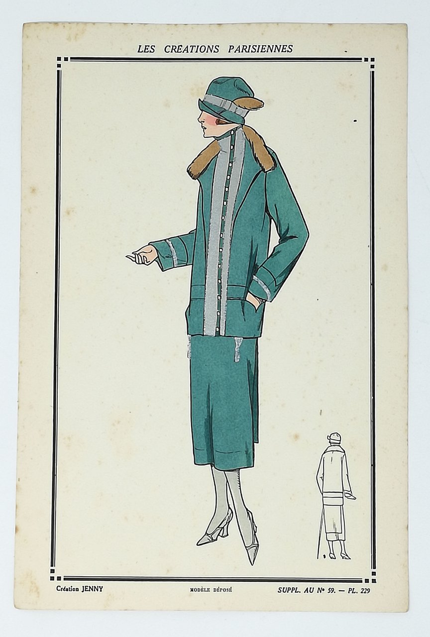 Bel Figurino a colori, con inserti dell'abito rifiniti con un colore argentato arricchito da brillantini, degno di essere inquadrato per essere esposto in un atelier di moda o in qualsiasi ambiente come elegante oggetto d'arredamento. Création Jenny. A colori con inserti dell'abito rifiniti con un colore argentato arricchito da brillantini. Dimensioni della stampa: 18,5 x 28 cm circa. Stato di conservazione: qualche macchiolina gialla ma, nel complesso, un buon esemplare. Presumibilmente anni '20 / '30 del secolo scorso.
