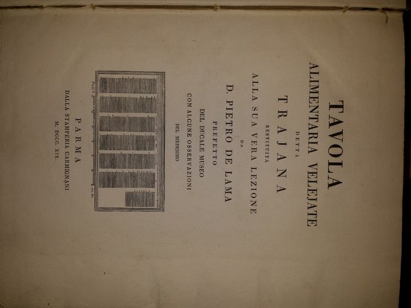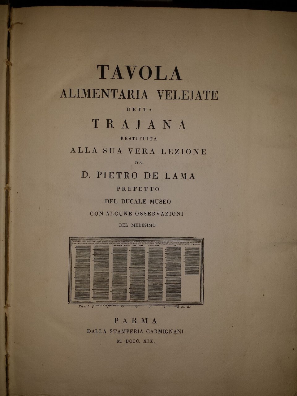 In-4 (29,5 cm) VII (1) 107 (1) 109-128 c. (di tav.) 129-189 (3). Mezza marocchino verde, con fregi e caratteri dorati al dorso. La tabula alimentaria traianea è un'iscrizione bronzea rinvenuta nei pressi di Velleia, nel comune piacentino di Lugagnano Val d'Arda, e conservata nel Museo archeologico nazionale di Parma. È la più grande iscrizione d'epoca romana, misura 1,38 m di altezza per 2,86 di larghezza. Il suo rinvenimento avvenne nel 1747, durante i lavori di sistemazione di un campo, smembrata e venduta per la fusione dall'arciprete di Mucinasso (PC), i pezzi furono recuperati, ricomposti e, su incarico di Pietro De Lama, restaurati nel 1817 da Pietro Amoretti, la scoperta diede l'avvio agli scavi che nel 1760 portarono alla luce le rovine di Veleia. Una copia è presente nell'Antiquarium di Velleia. L'istituzione degli Alimenta, voluta da parte dell'imperatore Traiano e ricordata da un rilievo rinvenuto nel Foro di Roma ed esposto nella Curia romana, consisteva in un prestito ipotecario concesso ai proprietari terrieri obligatio praediorum i cui interessi erano devoluti al mantenimento di fanciulli indigenti, con l'intento duplice di incrementare le attività agrarie e sostenere le famiglie povere per contrastare lo spopolamento delle campagne.In-4 (29.5 cm) VII (1) 107 (1) 109-128 c. (of table) 129-189 (3). Half green Moroccan, with golden friezes and characters on the back. The Trajan's food tabula is a bronze inscription found near Velleia, in the Piacenza municipality of Lugagnano Val d'Arda, and preserved in the National Archaeological Museum of Parma. It is the largest inscription of the Roman period, measuring 1.38 m in height by 2.86 in width. Its discovery took place in 1747, during the works to refurbish a field, dismembered and sold for fusion by the archpriest of Mucinasso (PC), the pieces were recovered, reassembled and, on behalf of Pietro De Lama, restored in 1817 by Pietro Amoretti, the discovery started the excavations that in 1760 brought to light the ruins of Veleia. A copy is present in the Antiquarium of Velleia. The institution of Alimenta, wanted by the Emperor Trajan and remembered by a relief found in the Forum of Rome and exhibited in the Roman Curia, consisted of a mortgage loan granted to landowners obligatio praediorum whose interests were devolved to the maintenance of indigent children , with the dual intent of increasing agricultural activities and supporting poor families to counteract the depopulation of the countryside.