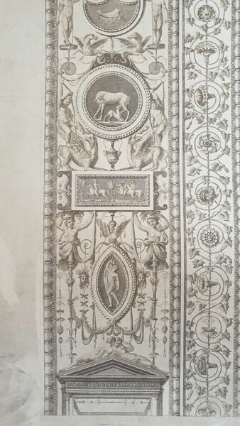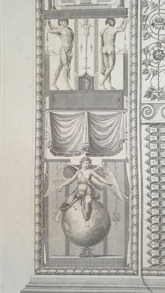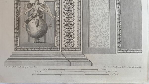 AUTORE: Giovanni Ottaviani su disegno di Gaetano Savorelli e Pietro Camporese DATA: 1774-1776 circa TECNICA: acquaforte DIMENSIONE DELLA PAGINA: 55x43 cm, 57x42 DIMENSIONE DELL'INCISIONE: 52x41 cm, 56x41 CONDIZIONI: buone In alto, a destra, dentro battuta "IV". In basso a sinistra "Cai Savorelli Pict., et Pet. Camporesi Arch. delin.", e a destra "Joann. Ottaviani sculp. Cum privilegio SS. D. N. Clementis XIII" Più sotto "Palmi .tre Romani, Piedi tre di Londra, Piedi tre di Parigi". " Splendida raccolta di incisioni litografiche di notevole dimensione incise da Giovanni Ottaviani su disegno di Gaetano Savorelli e Pietro Camporese. Le due incisioni che si completano vanno a formare la tavola quarta. La serie d'inicisioni, cui Volpato deve gran parte della propria notorietà nell'ambiente incisorio romano del suo tempo, è la prima opera che affronta la riproduzione degli ornati dei pilastri delle Logge, affrescate da Raffaello e allievi negli appartamenti vaticani, in modo dettagliato e completo. Uscirono in tre volumi, tra il 1772 e il 1776, frutto della collaborazione del pittore Gaetano Savorelli, dell'architetto Pietro Camporesi e dell'incisore Giovanni Ottaviani per la prima parte, cui dal 1772 si aggiunsero Ludovico Teseo e Volpato, che firmarono le tavole della terza parte raffigurante i pilastri." da Giovanni Volpato 1735-1803 p. 122. Volpato assunse la direzione dell'opera. In ottime condizioni.AUTHOR: Giovanni Ottaviani after Gaetano Savorelli and Pietro Camporese DATE: 1774-1776 circa TECHNIQUE: etching DIMENSION OF PAGE: 55x43 cm, 57x42 DIMENSION OF ENGRAVING: 52x41 cm, 56x41 CONDITIONS: good In the upper right edge, "IV". In the lower left edge "Cai Savorelli Pict., et Pet. Camporesi Arch. delin.", e a destra "Joann. Ottaviani sculp. Cum privilegio SS. D. N. Clementis XIII" Più sotto "Palmi .tre Romani, Piedi tre di Londra, Piedi tre di Parigi". " Wonderful collection of lythographed engravings of huge size engraved by Giovanni Ottaviani after Gaetano Savorelli and Pietro Camporese. These two engravings complete and form the fourth plate. This series of plates is the first work facing the reproduction of decoration of columns of lodges, painted as frescoes by Raffaello and pupils in Vatican apartments, in a complete and detailed way. The work was published in three volumes, between 1772 and 1776, fruit of cooperation with the painter Gaetano Savorelli, of the architect Pietro Camporesi and the engraver Giovanni Ottaviani for the first part, from 1772 Ludovico Teseo and Volpato, who signed the plates of third part featuring columns." from Giovanni Volpato 1735-1803 p. 122. Volpato got the direction of the work. In very good conditions.