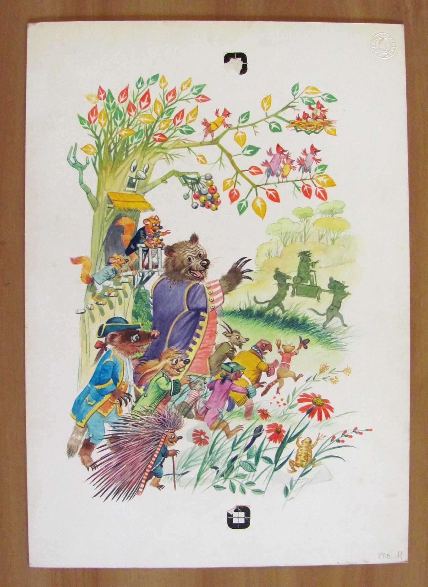 Le storie del gatto - "Il gallo in lettiga" - Disegno N.3 per Europea Editrice, anni '60. Tavola originale di Pescador per pagina 11 del libro, in tempera e acquarello su cartone. 25,5x36,5. Rara e in Ottimo stato. , Ottimo (Fine)