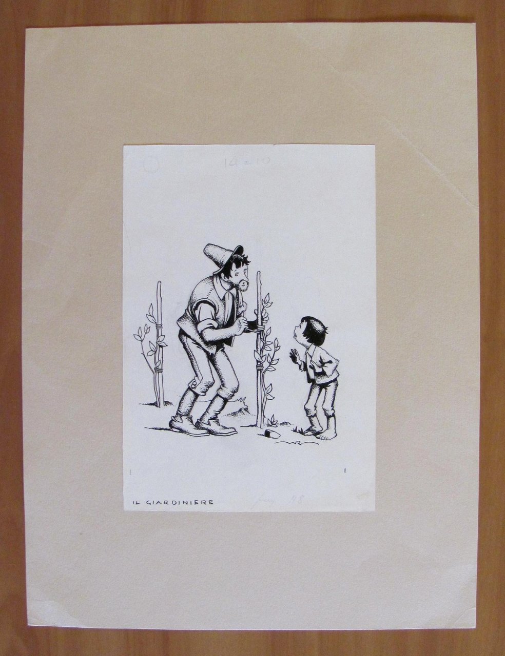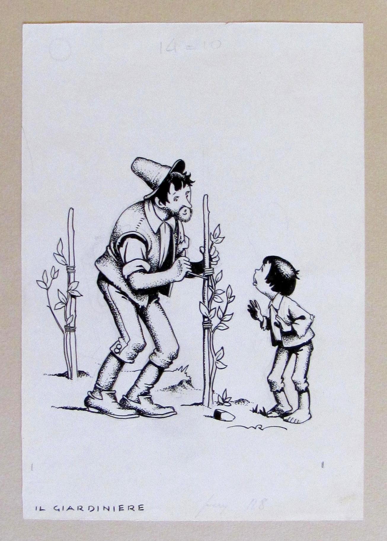 Nico Rosso - Il Giardiniere, 1940 ca. Tavola originale per per la pagina 118 di un libro, in china su carta lucida, firmata. 16,5x24 la tavola - 30x40 il cartoncino di base. Rara e in Ottimo stato. , Ottimo (Fine)