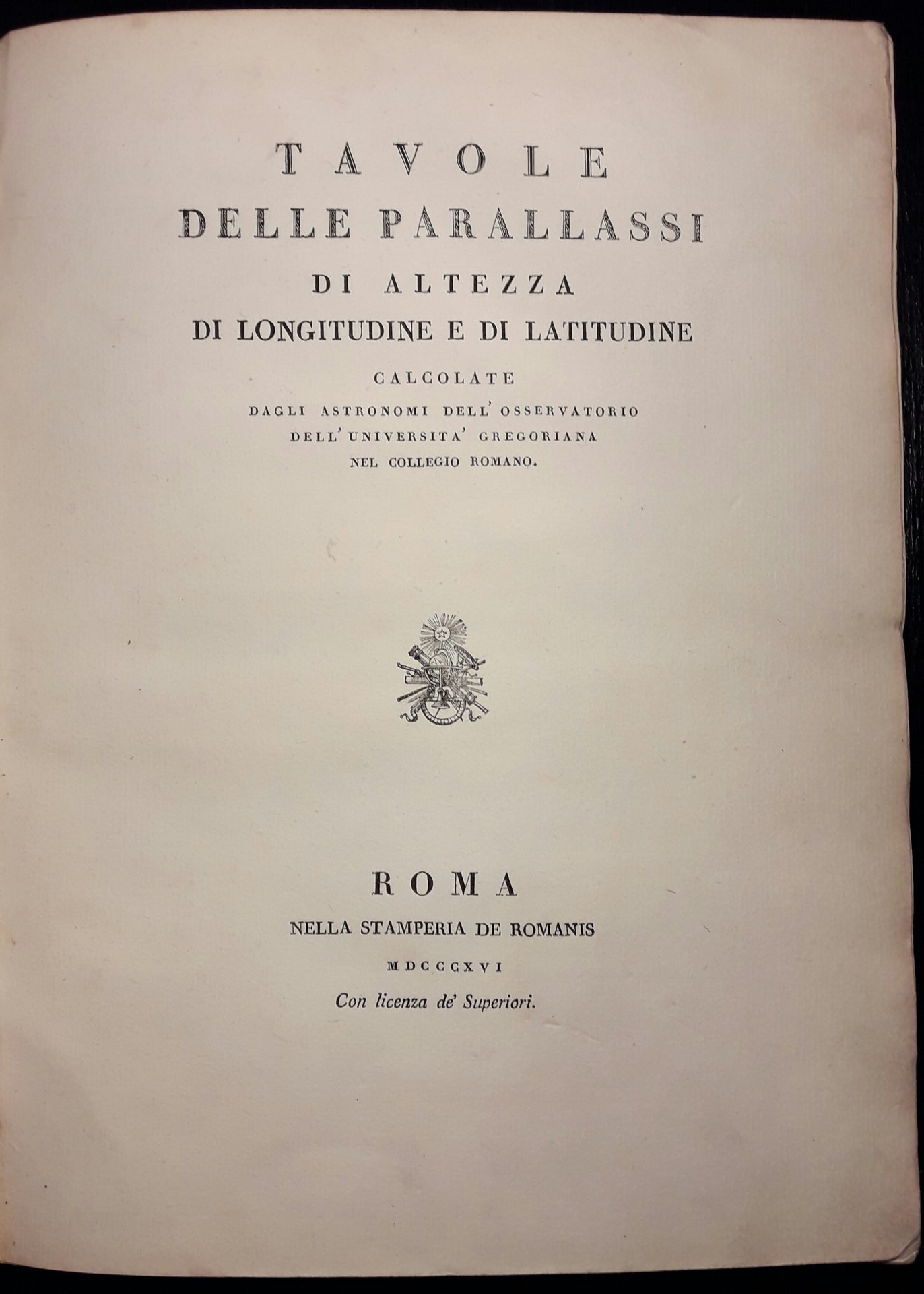 Tavole delle parallassi di altezza di longitudine e di latitudine calcolate dagli astronomi dell'osservatorio dell'Università Gregoriana nel Collegio Romano