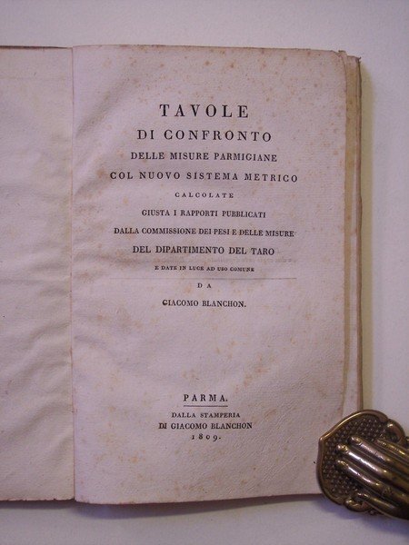 Tavole di confronto delle misure parmigiane col nuovo sistema metrico calcolate giusta i rapporti pubblicati dalla commissione dei pesi e delle misure del Dipartimento del Taro e date in luce ad uso comune da Giacomo Blanchon.